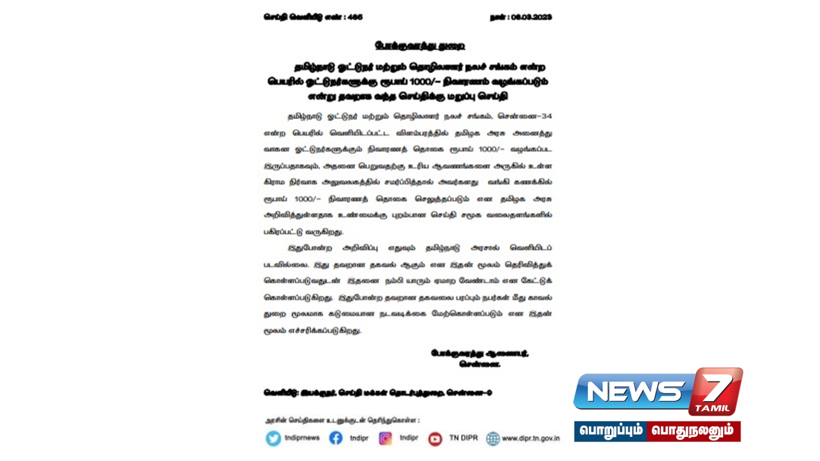 இதுகுறித்து சென்னை போக்குவரத்து ஆணையர் வெளியிட்டுள்ள செய்தியில், ‘தமிழ்நாடு ஓட்டுநர் மற்றும் தொழிலாளர் நலச் சங்கம், சென்னை-34 என்ற பெயரில் வெளியிடப்பட்ட விளம்பரத்தில் தமிழ்நாடு அரசு அனைத்து வாகன ஓட்டுநர்களுக்கும் நிவாரணத் தொகை ரூ.1000/- வழங்கப்பட இருப்பதாகவும், அதனைப் பெறுவதற்கு உரிய ஆவணங்களை அருகில் உள்ள கிராம நிர்வாக அலுவலகத்தில் சமர்ப்பித்தால் அவர்களது வங்கிக் கணக்கில் ரூ.1000/- நிவாரணத் தொகை செலுத்தப்படும் என தமிழ்நாடு அரசு அறிவித்துள்ளதாக உண்மைக்கு புறம்பான செய்தி சமூக வலைதளங்களில் பகிரப்பட்டு வருகிறது.