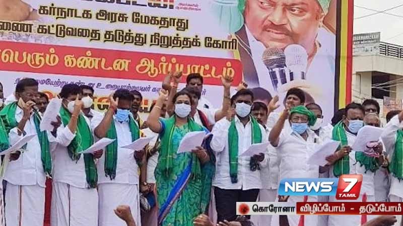 மேகதாது பகுதியில் அணை கட்டும் கர்நாடக அரசின் முயற்சிகளுக்கு எதிர்ப்பு தெரிவித்து, ஓசூரில், தேமுதிக பொருளாளர் பிரேமலதா தலைமையில் தேமுதிகவினர் நேற்று ஆர்ப்பாட்டம் நடத்தினர். முன்னதாக ட்ராக்டரில் ஊர்வலமாக வந்த பிரேமலதா, பின்னர் ஆர்ப்பாட்டத்தில் கலந்து கொண்டார். அப்போது கர்நாடக அரசை கண்டித்து முழக்கங்கள் எழுப்பப்பட்டன.