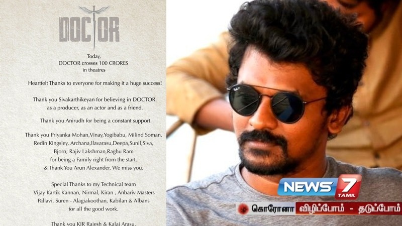 சிவகார்த்திகேயன் நடிப்பில் வெளியான ‘டாக்டர்’ படம் 100 கோடி ரூபாய் வசூலை தாண்டியுள்ளதற்கு இயக்குநர் நெல்சன் திலீப் குமார் உருக்கமுடன் நன்றி தெரிவித்து அறிக்கை ஒன்றை வெளியிட்டிருக்கிறார்.
