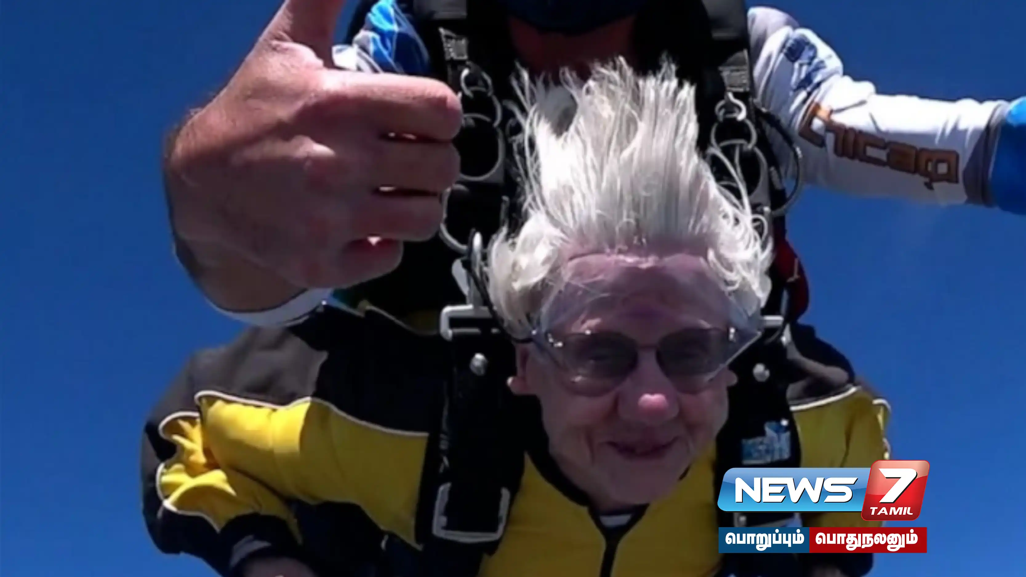 இது தொடர்பாக பேஸ்புக்கில் பகிரப்பட்ட வீடியோ லைக்குகளை அள்ளிக்குவிக்கிறது. அந்த வீடியோ ஆரம்பித்தவுடன், 104 வயதுடைய மூதாட்டி சிகாகோவை சேர்ந்த பயிற்றுவிப்பாளருடன் பாராசூட்டில் ஸ்கை டைவ்விங் செய்து வருகிறார்.