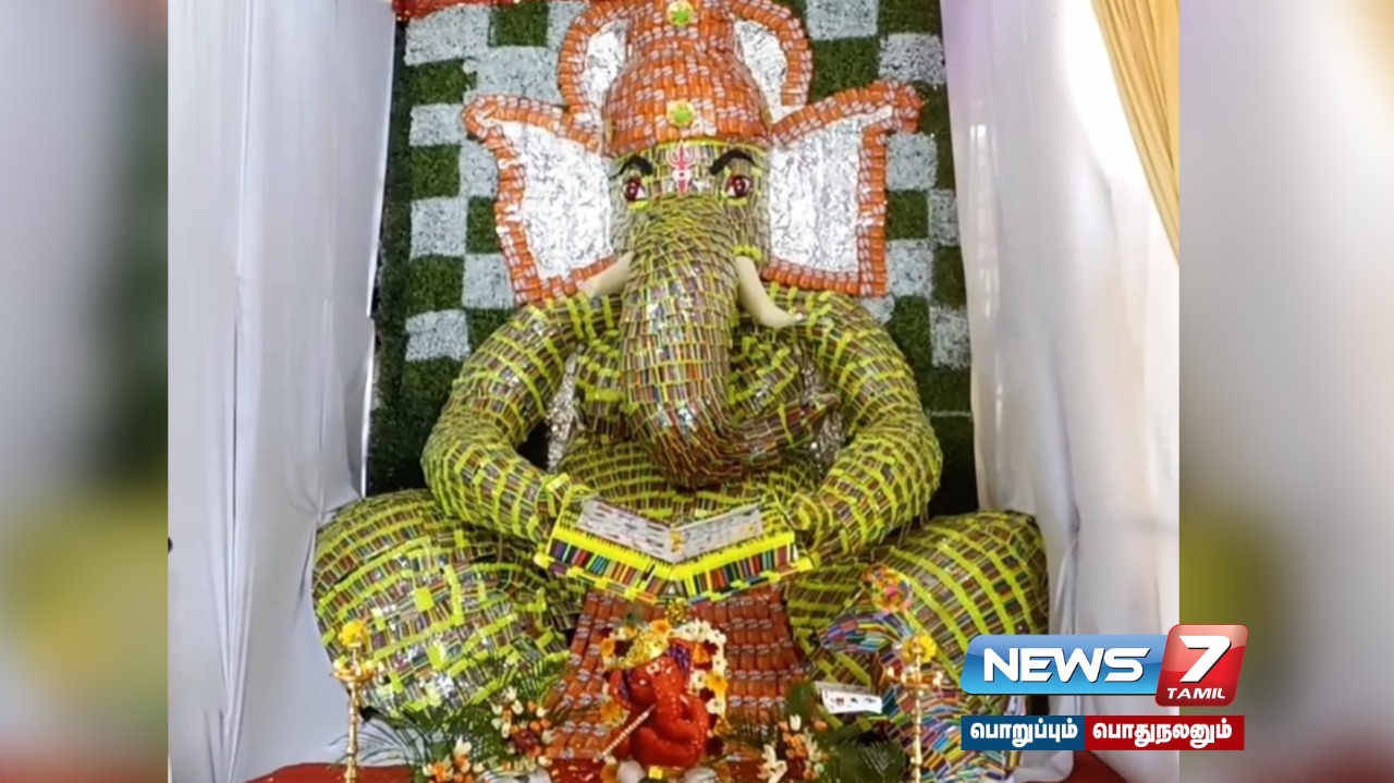 சென்னை மணலி பகுதியில் 35 ,000 ஆயிரம் கலர் பென்சில் மற்றும் 600 ஜாமென்ட்ரி பாக்ஸ்கள் மூலம் செய்யப்பட்ட 18 அடி உயரம் கொண்ட புத்தகம் படிக்கும் விநாயகர் சிலை அப்பகுதி மக்களிடையே பெரும் வரவேற்பு பெற்றுள்ளது.