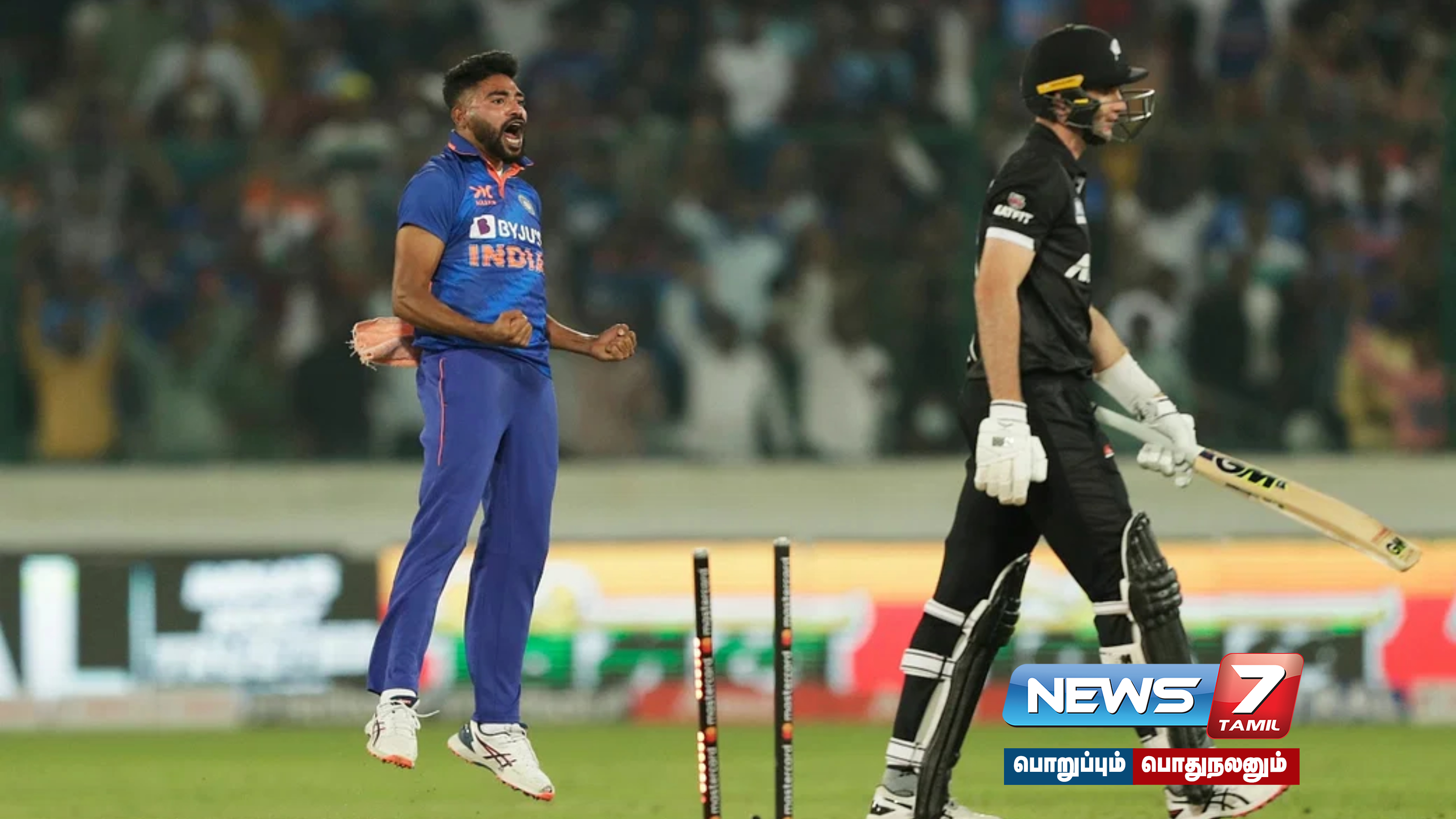 இதையடுத்து களமிறங்கிய பிராஸ்வெல் மற்றும் மிட்செல் சாண்ட்னர் இணை, அதிரடியாக ஆடத் தொடங்கினர். சாண்ட்னர் 57 ரன்கள் குவித்த நிலையில் ஆட்டமிழந்தாலும், பிராஸ்வெல் சிறப்பான ஆட்டத்தி வெளிப்படுத்தி 77 பந்துகளில், 140 ரன்கள் குவித்தார். ஆனால், இறுதிவரை கடுமையாக போராடிய நியூசிலாந்து அணி, 49.2 ஓவர்களில் 337 ரன்கள் எடுத்திருந்த நிலையில், ஆல்-அவுட் ஆனது. இதன்மூலம் 12 ரன்கள் வித்தியாசத்தில் இந்திய அணி த்ரில் வெற்றி பெற்றது. இந்திய அணி தரப்பில் அதிகபட்சமாக முகமது சிராஜ் 4 விக்கெட்டுகளும், குல்தீப் யாதவ் மற்றும் ஷர்துல் தாக்கூர் தலா 2 விக்கெட்டுகளும் வீழ்த்தினர்.