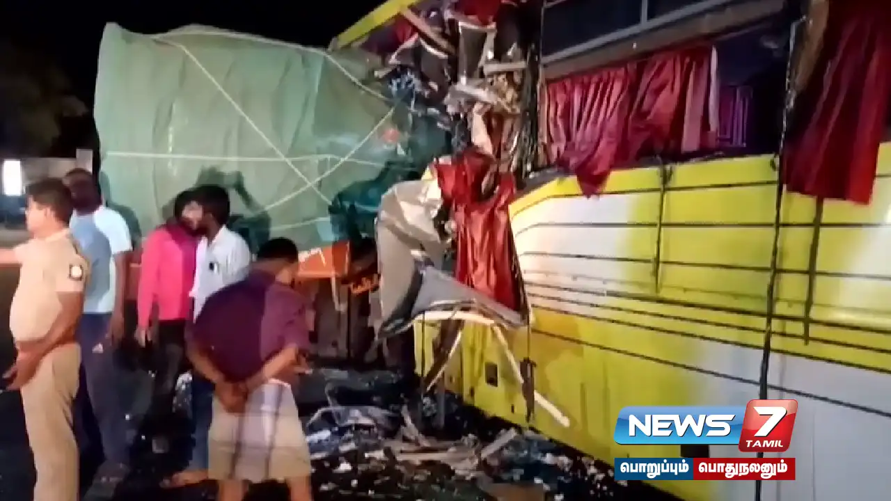 லாரி ஒன்று சென்றுள்ளது. அதன் பின்புறத்தில் திருச்சியிலிருந்து 40க்கும் மேற்பட்ட பயணிகளை ஏற்றுக்கொண்டு தனியார் ஆம்னி பேருந்து சென்னையை நோக்கி திருச்சி பிரதான சாலையில் சென்று கொண்டிருந்தது.