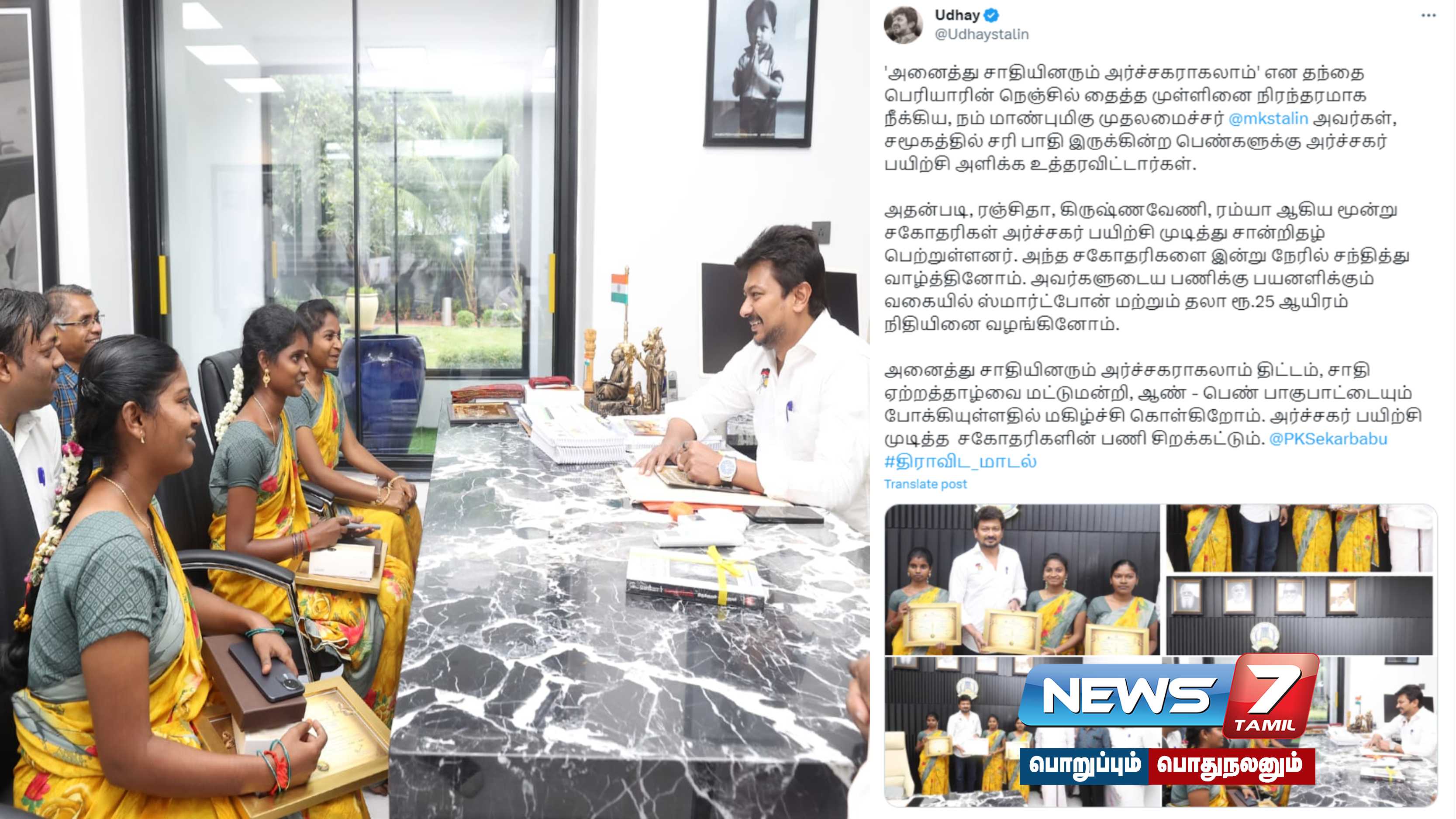 அந்த சகோதரிகளை இன்று நேரில் சந்தித்து வாழ்த்தினோம். அவர்களுடைய பணிக்கு பயனளிக்கும் வகையில் ஸ்மார்ட்போன் மற்றும் தலா ரூ.25 ஆயிரம் நிதியினை வழங்கினோம். அனைத்து சாதியினரும் அர்ச்சகராகலாம் திட்டம், சாதி ஏற்றத்தாழ்வை மட்டுமன்றி, ஆண் – பெண் பாகுபாட்டையும் போக்கியுள்ளதில் மகிழ்ச்சி கொள்கிறோம். அர்ச்சகர் பயிற்சி முடித்த சகோதரிகளின் பணி சிறக்கட்டும்.” இவ்வாறு பதிவிட்டுள்ளார்.