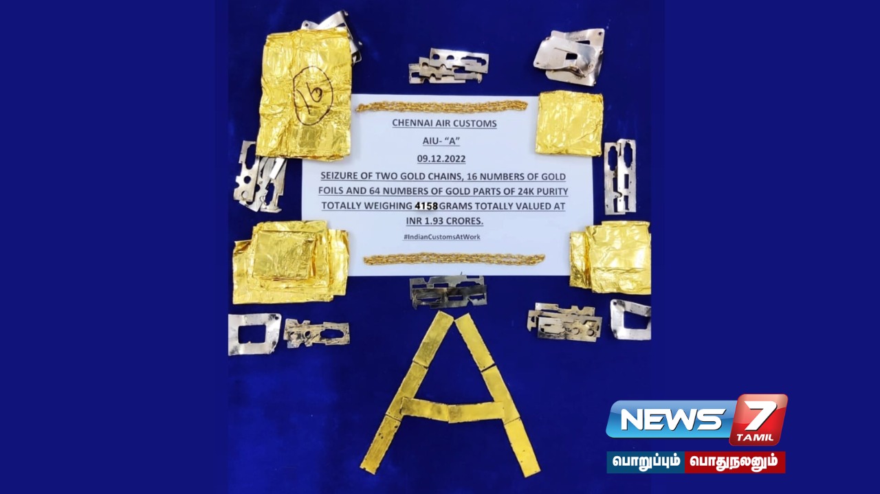 துபாயில் இருந்து கடத்தி வந்த ரூ.1 கோடியே 93 லட்சம் மதிப்புள்ள 4 கிலோ 158 கிராம் தங்கத்தை சென்னை விமானநிலைய சுங்கத்துறை அதிகாரிகள் பறிமுதல் செய்தனர்.