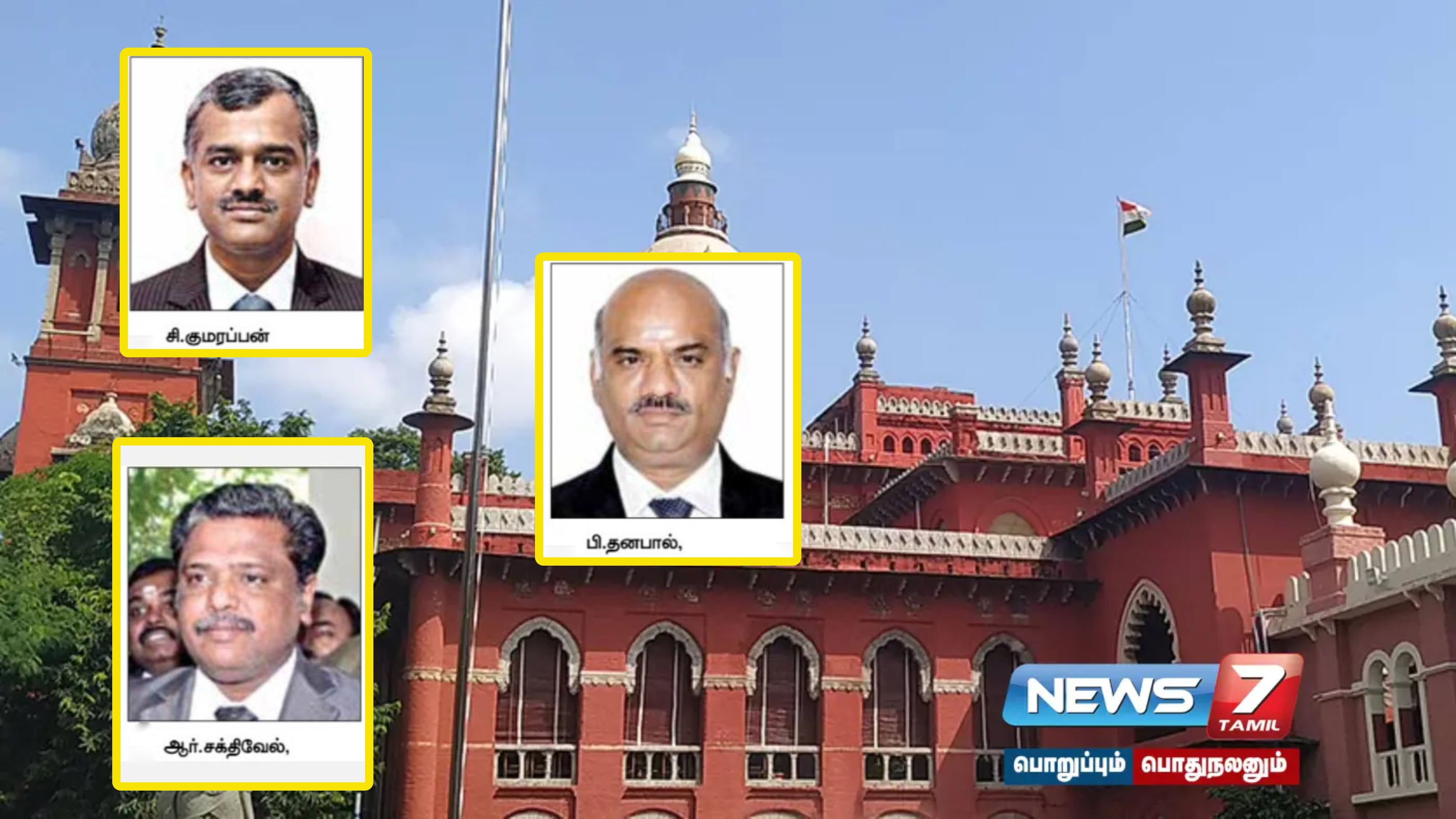 சென்னை உயர்நீதிமன்றத்தில் மொத்தம் 75 நீதிபதி பணியிடங்கள் உள்ளன. தற்போது 60 நீதிபதிகள் பணியாற்றி வரும் நிலையில், கிருஷ்ணகிரி மாவட்ட முதன்மை நீதிபதி ஆர்.சக்திவேல், சென்னை உயர்நீதிமன்ற தலைமை பதிவாளர் பி.தனபால், சென்னை தொழிலாளர் நீதிமன்ற முதன்மை நீதிபதி சி.குமரப்பன், கோவை மாவட்ட முதன்மை நீதிபதி கே.ராஜசேகர் ஆகியோரை சென்னை உயர்நீதிமன்ற நீதிபதிகளாக நியமித்து குடியரசுத்தலைவர் திரௌபதி முர்மு உத்தரவு பிறப்பித்தார்.