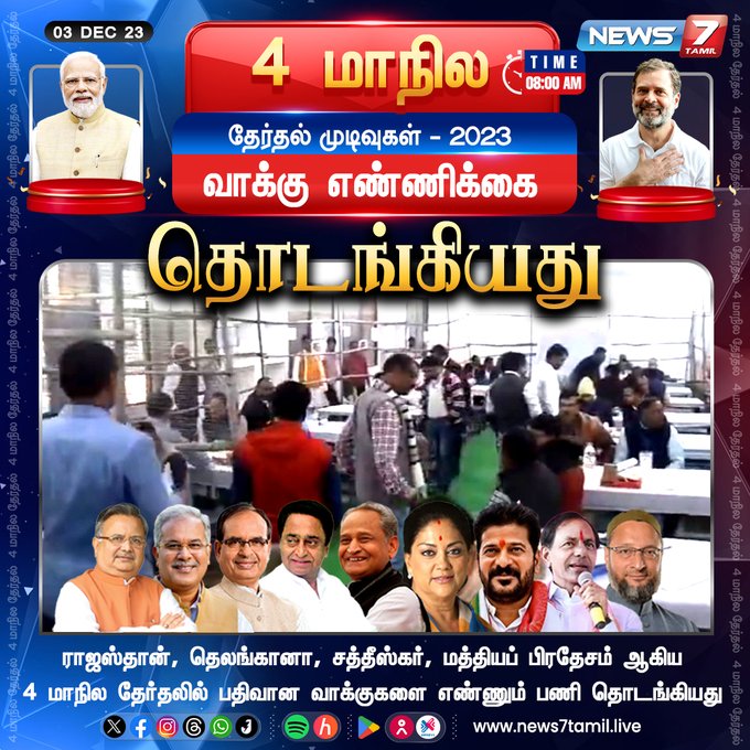 இந்த நிலையில் நவம்பர் 30 ஆம் தேதியன்று நடந்து முடிந்து 5 மாநில தேர்தலுக்கு பிந்தைய கருத்துக் கணிப்பு முடிவுகள் வெளியாகின. இந்த நிலையில் காலை 8 மணிக்கு நடந்து முடிந்த 5 மாநில சட்டப்பேரவைத் தேர்தலில் ராஜஸ்தான், மத்திய பிரதேசம், தெலங்கானா, சத்தீஸ்கர் ஆகிய 4 மாநிலங்களுக்கான வாக்கு எண்ணிக்கை தொடங்கியது.