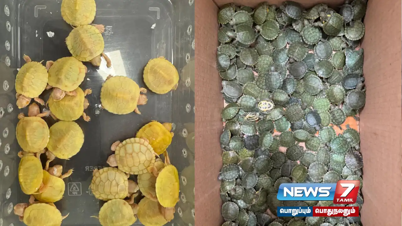 கோலாலம்பூரிலிருந்து சென்னைக்கு விமானம் மூலம் கடத்தி வரப்பட்ட 4986 ஆமைகள் போலீசாரால் பறிமுதல் செய்யப்பட்டன.