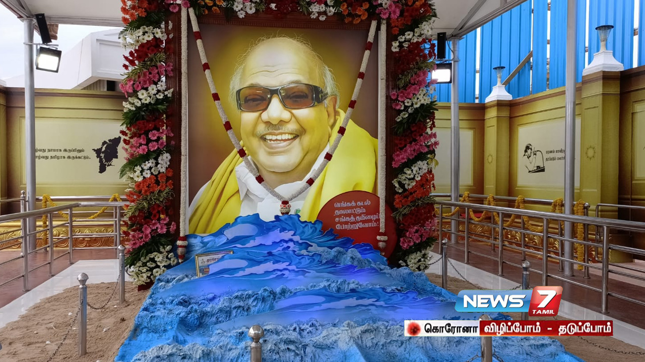 இது ஒருபுறம் இருக்கக் கருணாநிதியின் உடல் அடக்கம் செய்யப்பட்டது முதல் அந்த நினைவிடம் நாள்தோறும் கட்சியினர் சார்பில் மலர்களால் தினசரி அலங்காரம் செய்யப்படுகிறது. இந்த நிலையில், 4-ஆம் ஆண்டு நினைவை அனுசரிக்கும் விதமாகக் கருணாநிதி நினைவிடத்தில், கடல் போன்ற மாதிரியை வடிவமைத்து அலங்கரித்துள்ளனர்.