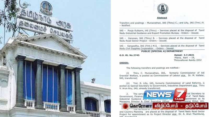 தமிழ்நாட்டில் 5 ஐஏஎஸ் அதிகாரிகளை பணியிட மாற்றம் செய்து அரசு உத்தரவிட்டுள்ளது. அதன்படி, தொழிலாளர் நலத்துறை ஆணையராக முனியநாதன் நியமனம் செய்யப்பட்டுள்ளார். தொழிற்துறை சிறப்புச் செயலாளராக லில்லி ஐஏஎஸ் நியமனம் செய்யப்பட்டுள்ளதாகவும்,