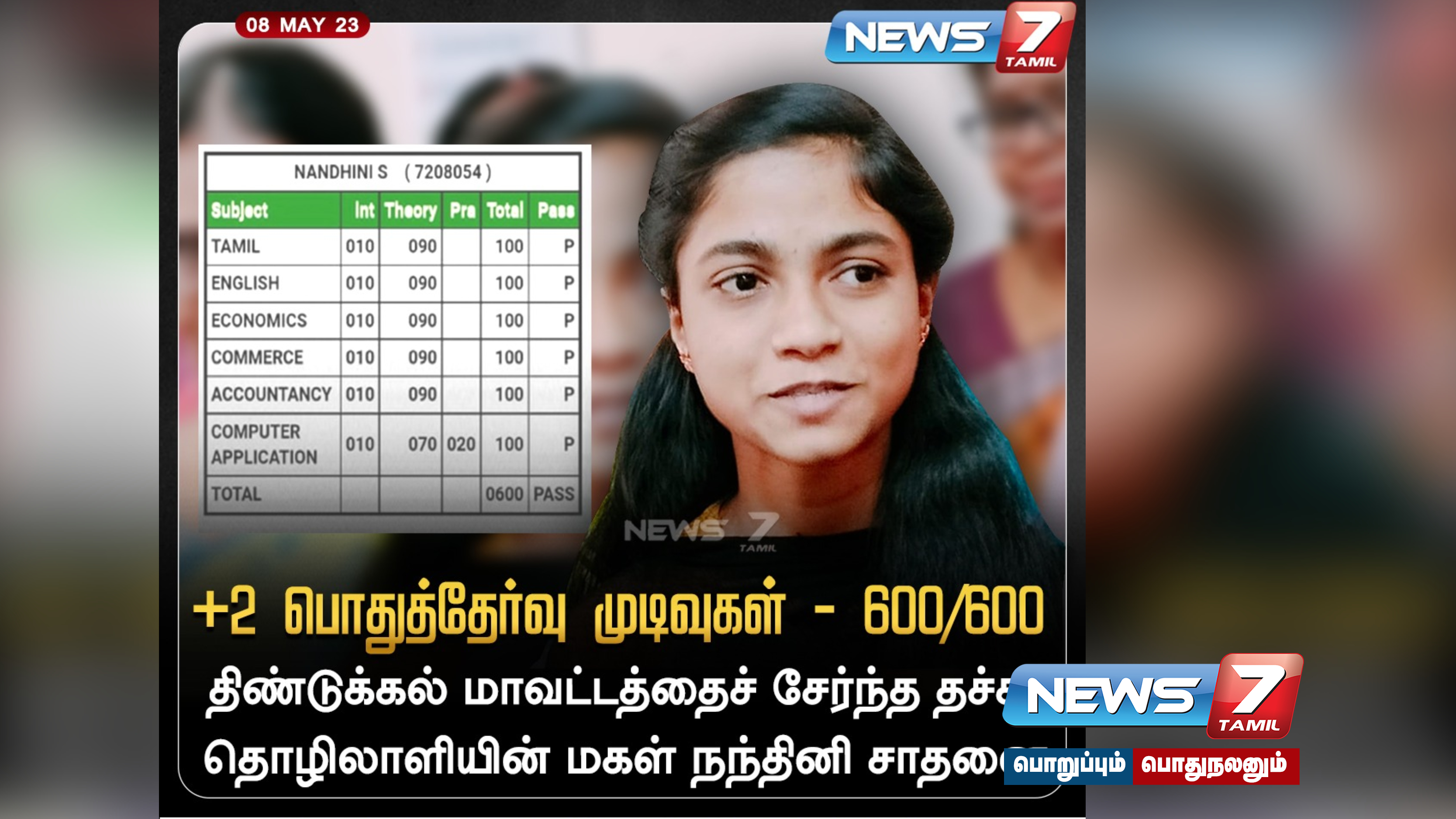 இந்நிலையில் திண்டுக்கல் பாரதி புரத்தை சேர்ந்த கூலி தொழிலாளி சரவணகுமார், பாலப்பிரியா தம்பதியின் மகள் நந்தினி. திண்டுக்கல் அண்ணாமலையார் மில்ஸ் பெண்கள் மேல்நிலை பள்ளியில் 12ம் வகுப்பு படித்தார். இன்று தேர்வு முடிவுகள் வெளியான நிலையில் நந்தினி தமிழ், ஆங்கிலம், பொருளியல், வணிகவியல், கணக்குப்பதிவியல், கம்ப்யூட்டர் அப்ளிகேஷன் உள்ளிட்ட . பாடங்களிலும் 100 மதிப்பெண்கள் எடுத்து மொத்தமாக 600 மதிப்பெண்கள் எடுத்து சாதனை படைத்துள்ளார்.