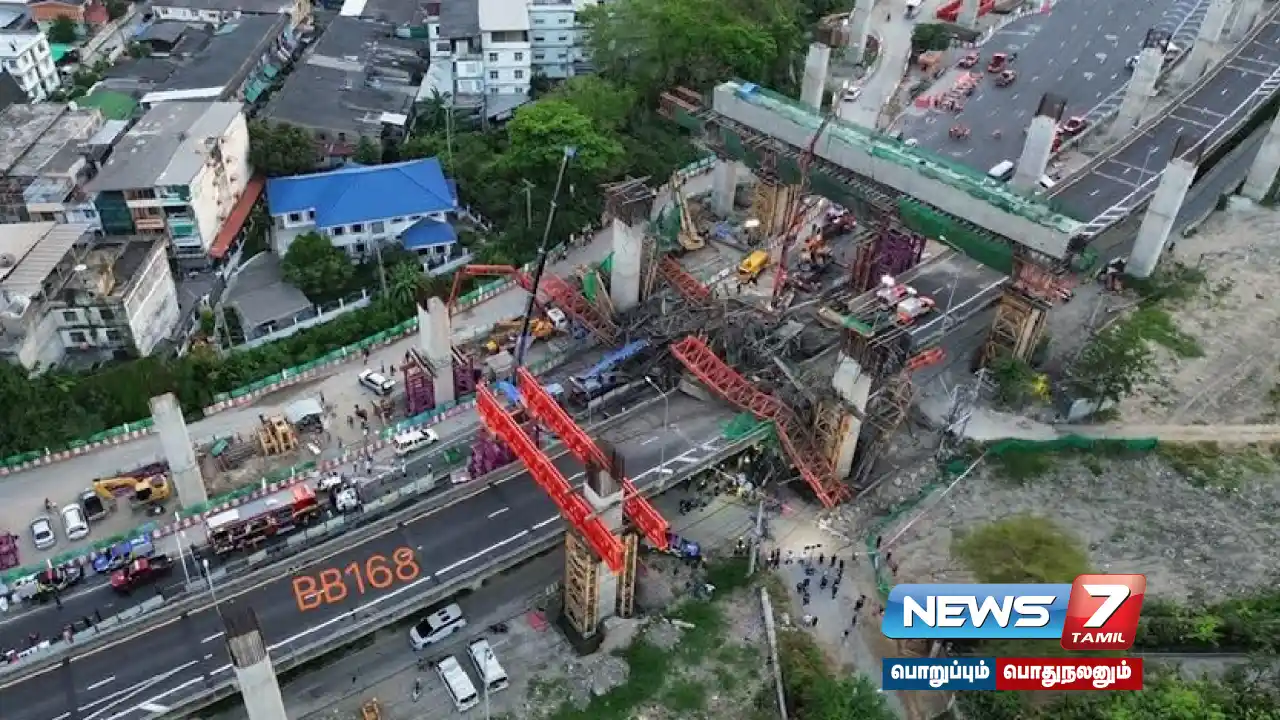 தாய்லாந்து தலைநகர் பாங்காக் நெடுஞ்சாலை மிகவும் பரபரப்பான சாலை ஆகும். இதனால் ஏற்படும் போக்குவரத்து நெரிசலை சமாளிக்க அங்கு புதிதாக மேம்பாலம் கட்டப்பட்டு வருகிறது. இந்த நிலையில் மேம்பாலம் கட்டுமானப் பணியில் தொழிலாளர்கள் ஈடுபட்டுள்ளனர். அப்போது திடீரென பாலத்தின் ஒரு பகுதி இடிந்து விழுந்துள்ளது.