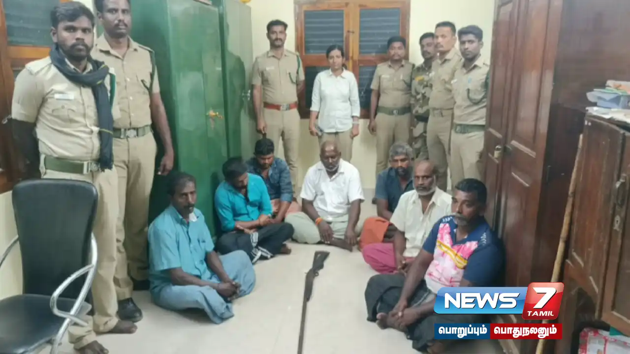 அப்போது, முருகன் என்பவரது கரும்பு தோட்டத்தில் நாட்டுத் துப்பாக்கியுடன் 7 நபர்கள் பதுங்கி இருந்தது தெரியவந்தது. அதனை தொடர்ந்து, அந்த நபர்களை கைது செய்த வனத்துறையினர் அவர்களிடமிருந்து நாட்டு துப்பாக்கியை பறிமுதல் செய்தனர்.