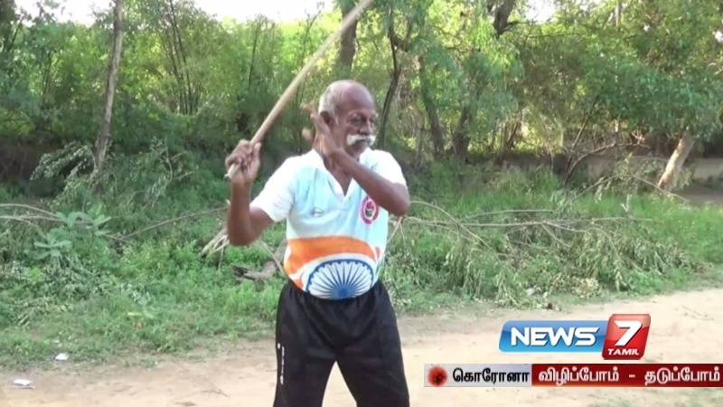 தூத்துக்குடி மாவட்டம் ஆழ்வார்திருநகரியை சேர்ந்த ஓய்வுபெற்ற தலைமை ஆசிரியர் சண்முகசுந்தரம், இளைஞரை போல் சுறுசுறுப்புடனும், வேகத்துடனும் ஆணி படுக்கை மேல் நின்று சிலம்பம் சுற்றி அசத்தி வருகிறார்.