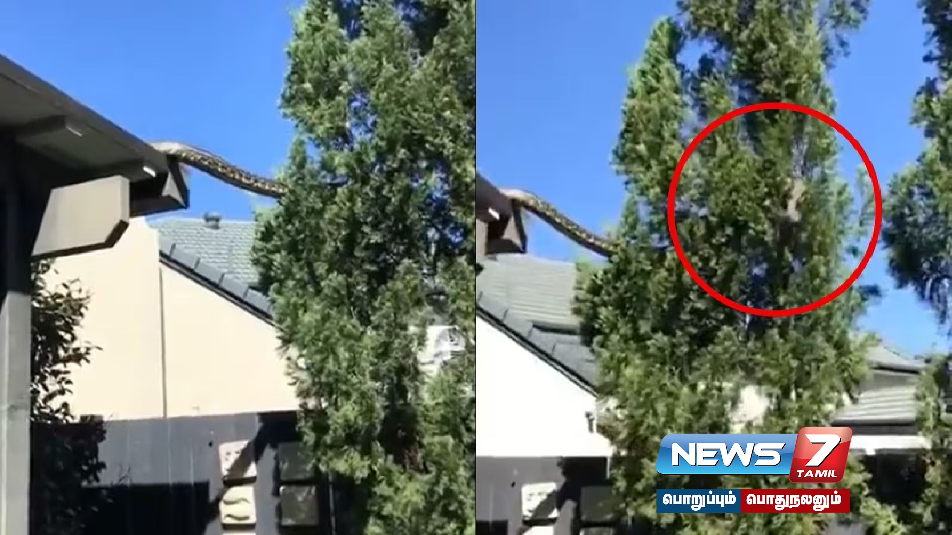 வீடுகளின் மேலே உள்ள கூரைகளின் வழியாக ராட்சத மலைப்பாம்பு மரத்திற்கு ஊர்ந்து செல்லும் வீடியோ இணையத்தில் வைரலாகி வருகிறது.