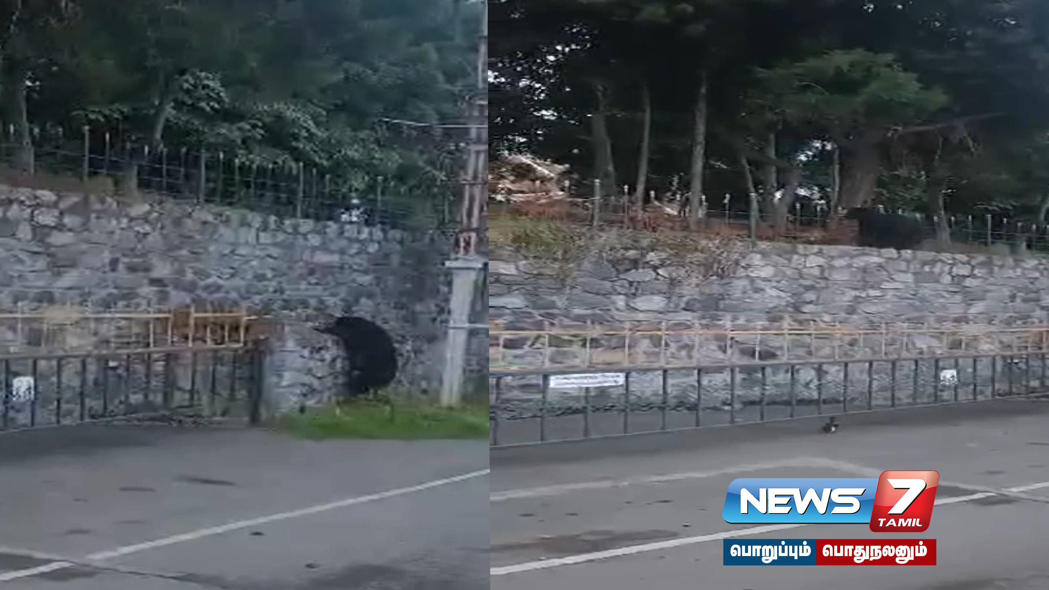 நீலகிரி மாவட்டம் கோத்தகிரி வனப்பகுதியில் இருந்து வெளியேறிய கரடி ஒன்று லூக்ஸ் தேவாலயம் அருகே குடியிருப்பு பகுதியில் உலா வந்தது. நாய்கள் குறைத்ததால் அச்சமடைந்த கரடி தேவாலயத்தின் அருகே உள்ள 10 அடி உயரம் கொண்ட தடுப்புச் சுவரின் மீது ஏறி அருகில் உள்ள வனப்பகுதிக்குள் சென்றது.