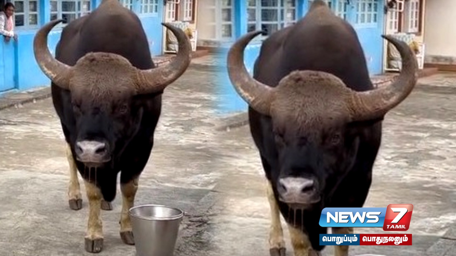 கிராம மக்கள் காட்டெருமையின் தாகத்தை போக்க, ஒரு வாலி முழுவதும் தண்ணீர்