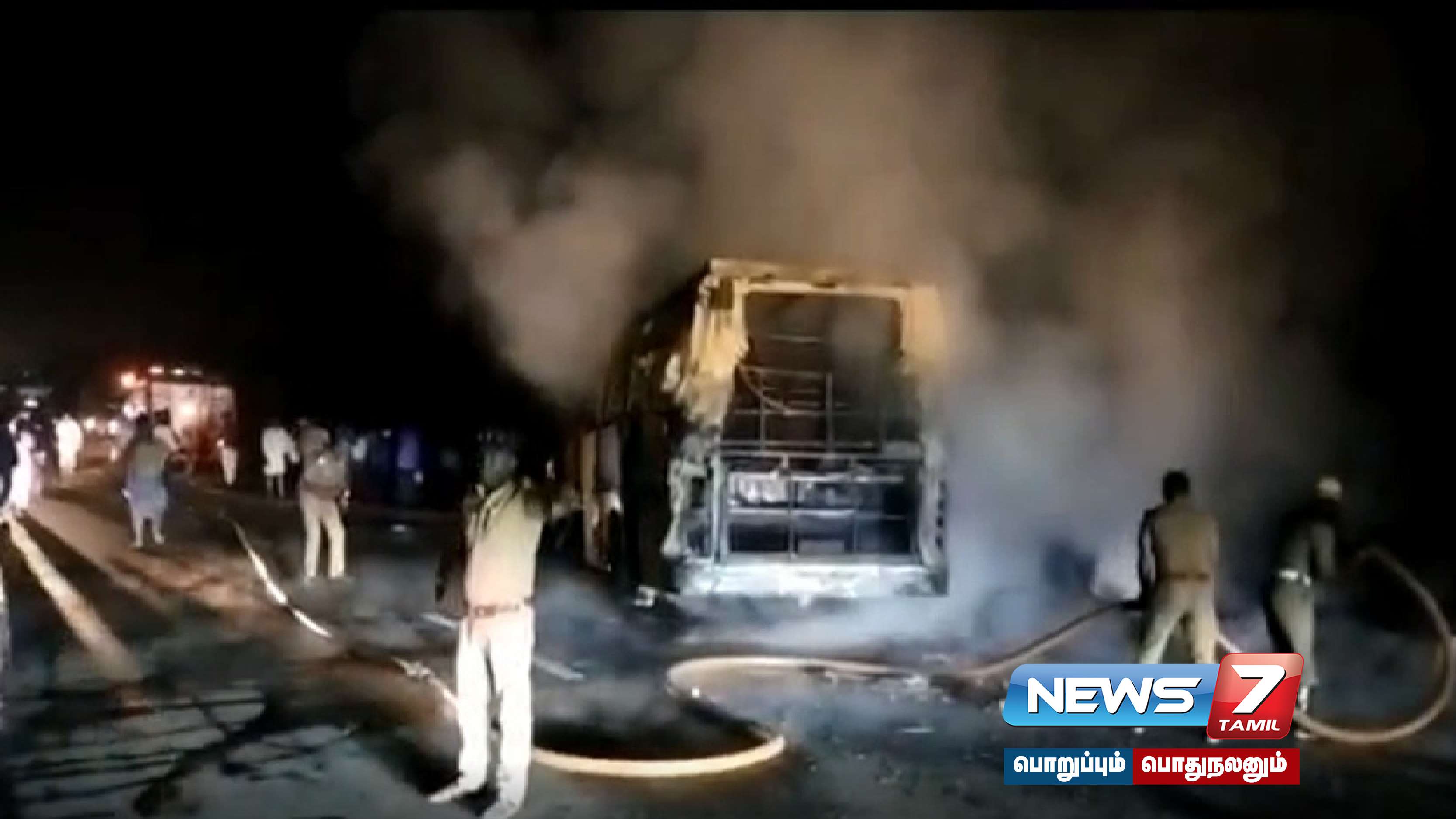 அப்போது சென்னை நோக்கி சென்று கொண்டிருந்த லாரியில் இருந்த டிரைவர் உடனடியாக லாரியை ஓரமாக நிறுத்திவிட்டு லாரியில் இருந்து இரும்பு ராடால் பஸ்ஸின் கண்ணாடிகளை உடைத்து பயணிகளை வெளியேற வழி ஏற்படுத்தினார் உடனடியாக பயணிகள் அனைவரும் வேகமாக இறங்கினர். அப்போது பஸ் முழுமையாக தீப்பிடித்தது.