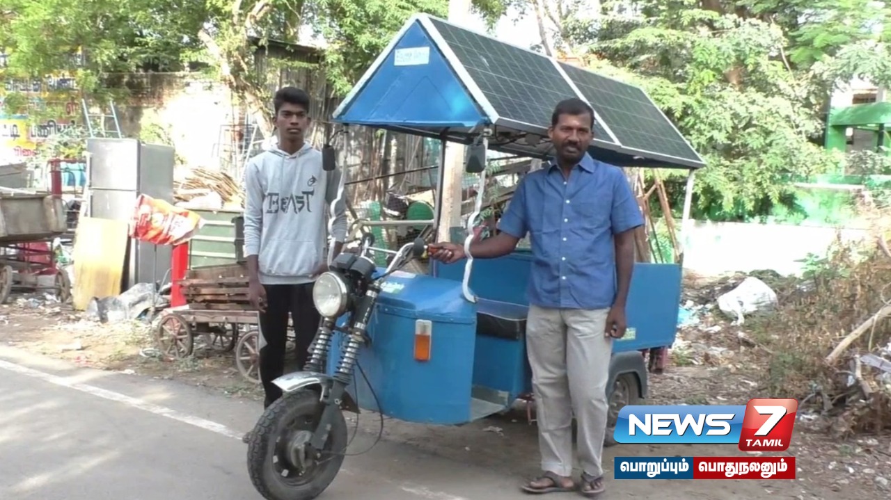 கோவில்பட்டி வியாபாரி ஒருவர் தனது சொந்த முயற்சியில் சூரிய சக்தியில் ஓடும் மூன்று சக்கர வாகனத்தை உருவாக்கி அசத்தியுள்ளார்.