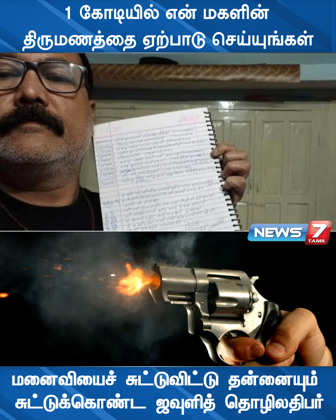 1 கோடியில் என் மகளின் திருமணத்தை ஏற்பாடு செய்யுங்கள் என வீடியோ பதிவு ஒன்றை வெளியிட்டு மனைவியைச் சுட்டுவிட்டு தன்னையும் சுட்டுக்கொண்ட ஜவுளித் தொழிலதிபர்.