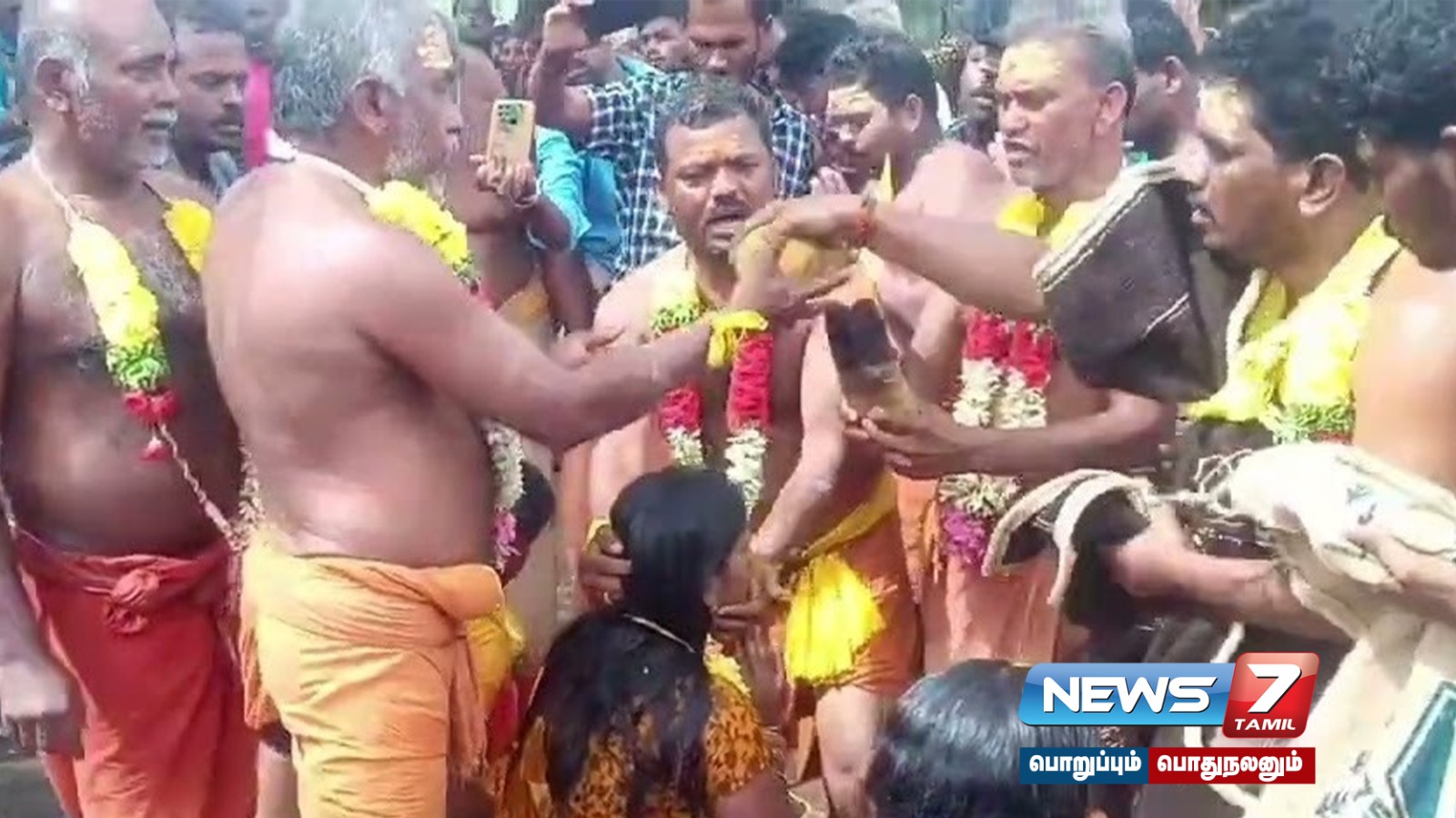 கரூர் அருகே பெரிய சேங்கல் கிராமத்தில் பங்காளிகள் ஒன்று கூடி நடைபெற்ற திருவிழாவில் தலையில் தேங்காய் உடைப்பு மற்றும் சாட்டையடி வினோத நிகழ்ச்சி நடைபெற்றது.