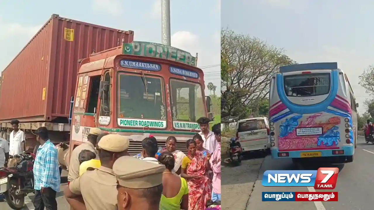 நெடுஞ்சாலையில் இன்று (மார்ச் 12) காலை தனியார் பேருந்தும், கன்டெய்னர் லாரியும் உரசி விபத்துக்குள்ளாகின. இந்த விபத்தில் பேருந்தின் படியில் தொங்கியபடி பயணித்த மோனிஷ், கமலேஷ் உள்ளிட்ட கல்லூரி மாணவர்கள் 3 பேர் சம்பவ இடத்திலேயே உயிரிழந்தனர்.