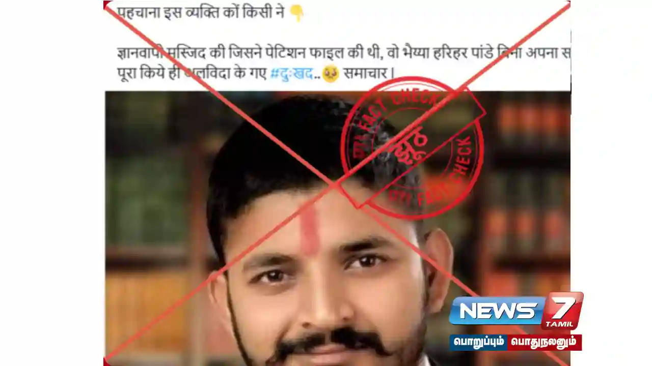 ஞானவாபி மசூதி வழக்கில் மனு தாக்கல் செய்த ஹரிஹர் பாண்டேவின் சமீபத்தில் இறந்துவிட்டதாக சமூக வலைதளங்களில் செய்தி பகிரப்பட்டது. PTI Fact Check Desk விசாரணையில் வைரலான படம் ஹரிஹர் பாண்டே அல்ல என்பது தெளிவாகிறது. இந்த புகைப்படம் சமூக வலைதளங்களில் பொய்யான செய்திகளுடன் பகிரப்பட்டு வருகிறது. ஹரிஹர் பாண்டே ஒரு வருடத்திற்கு முன்பு 2023 இல் இறந்துவிட்டார் என்பது குறிப்பிடத்தக்கது