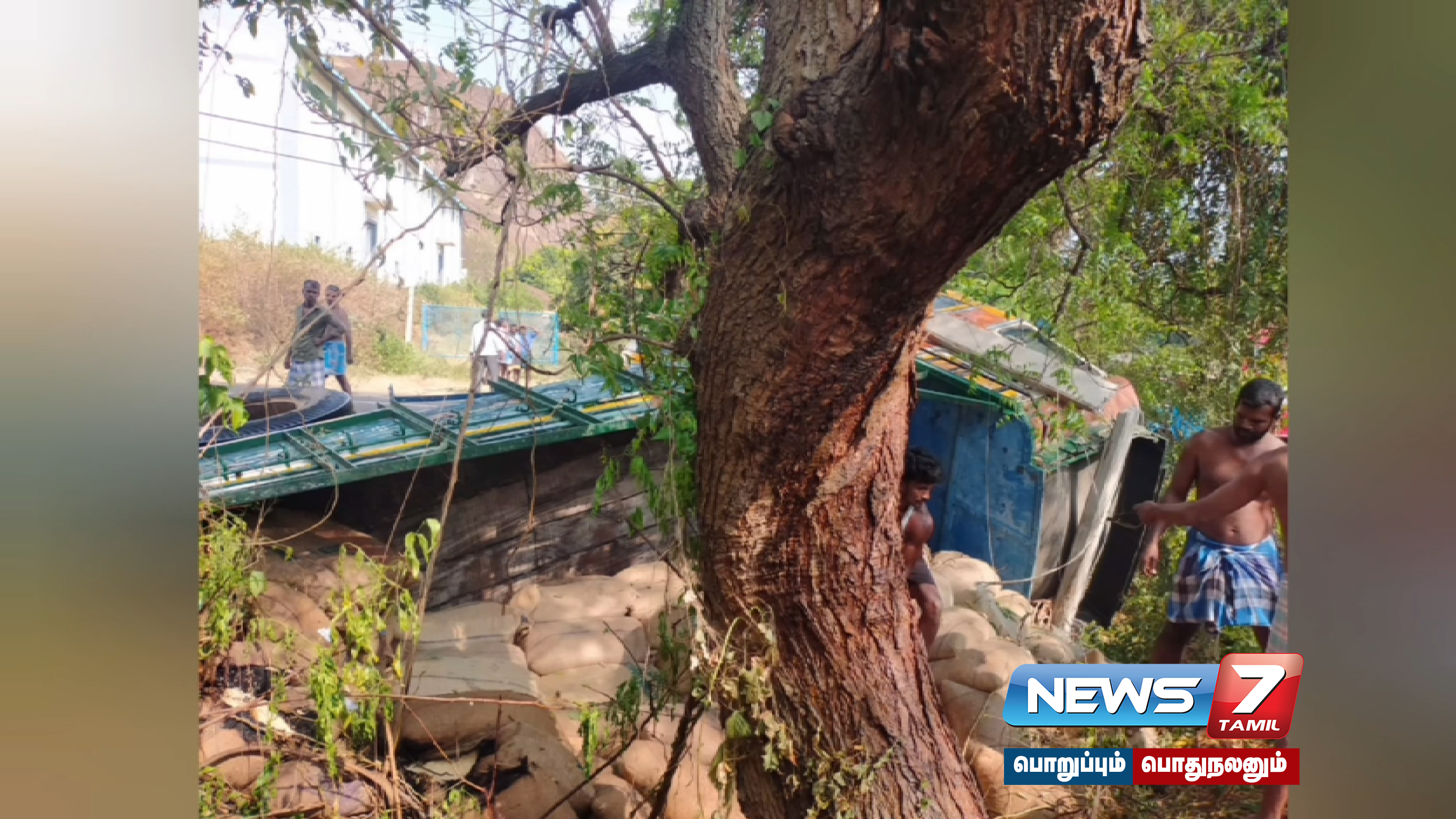ரேசன் அரிசி மூட்டைகளை ஏற்றிச் சென்ற லாரி கவிழ்ந்து தீ விபத்து