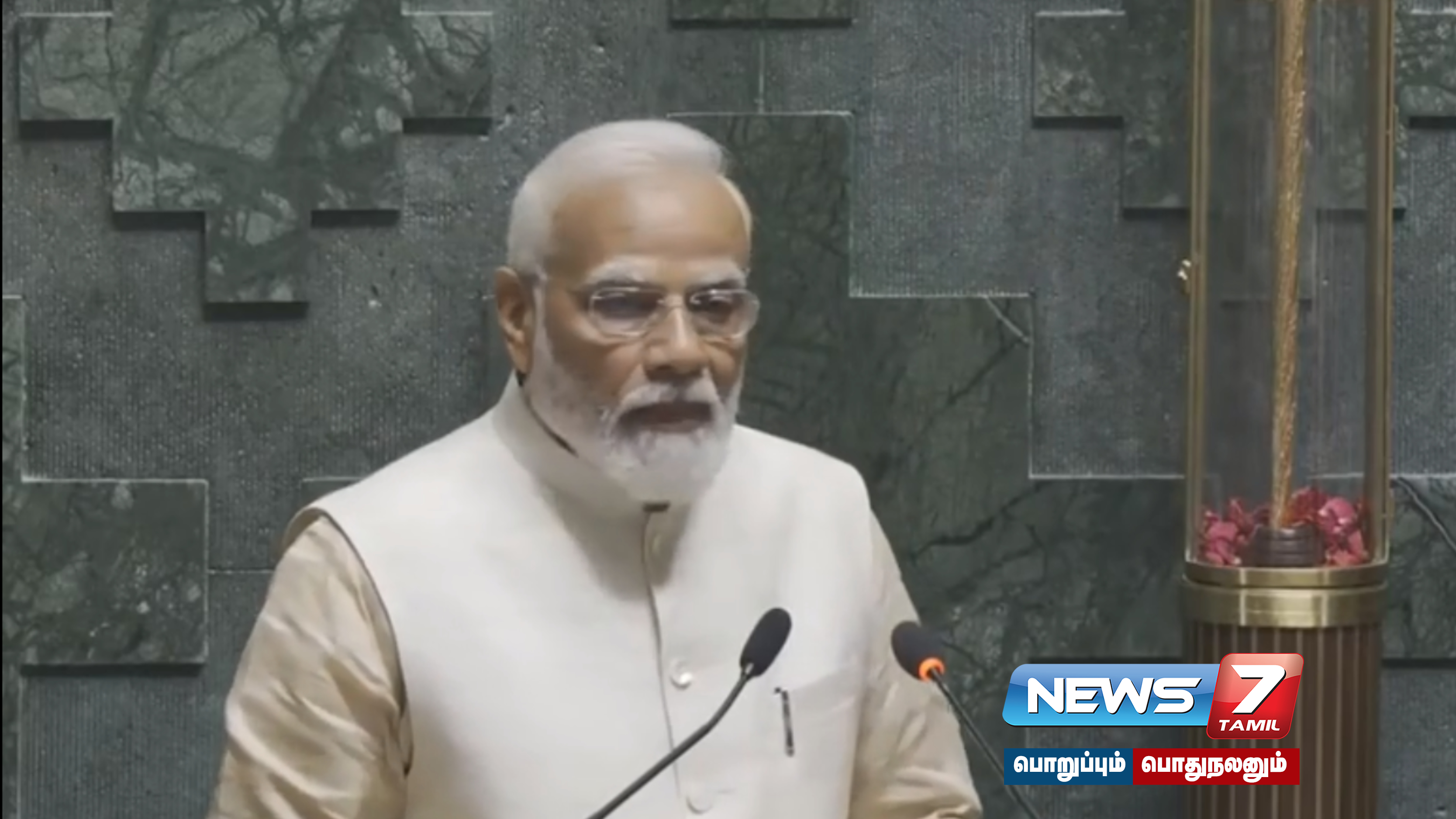 குடியரசுத் தலைவர் திரௌபதி முர்மு மற்றும் குடியரசு துணை தலைவர் ஜெகதீப் தன்கர் ஆகியோரின் வாழ்த்துரை வாசித்தார். பின்னர் புதிய நாடாளுமன்ற கட்டடம் குறித்த குறும்படம் ஒளிபரப்பப்பட்டது. இந்த குறும்படத்தில் தமிழ்நாட்டின் செங்கோலின் சிறப்புகள் மற்றும் சங்காராச்சியர்கள் குறித்த தகவல்கள் இடம்பெற்றிருந்தன.