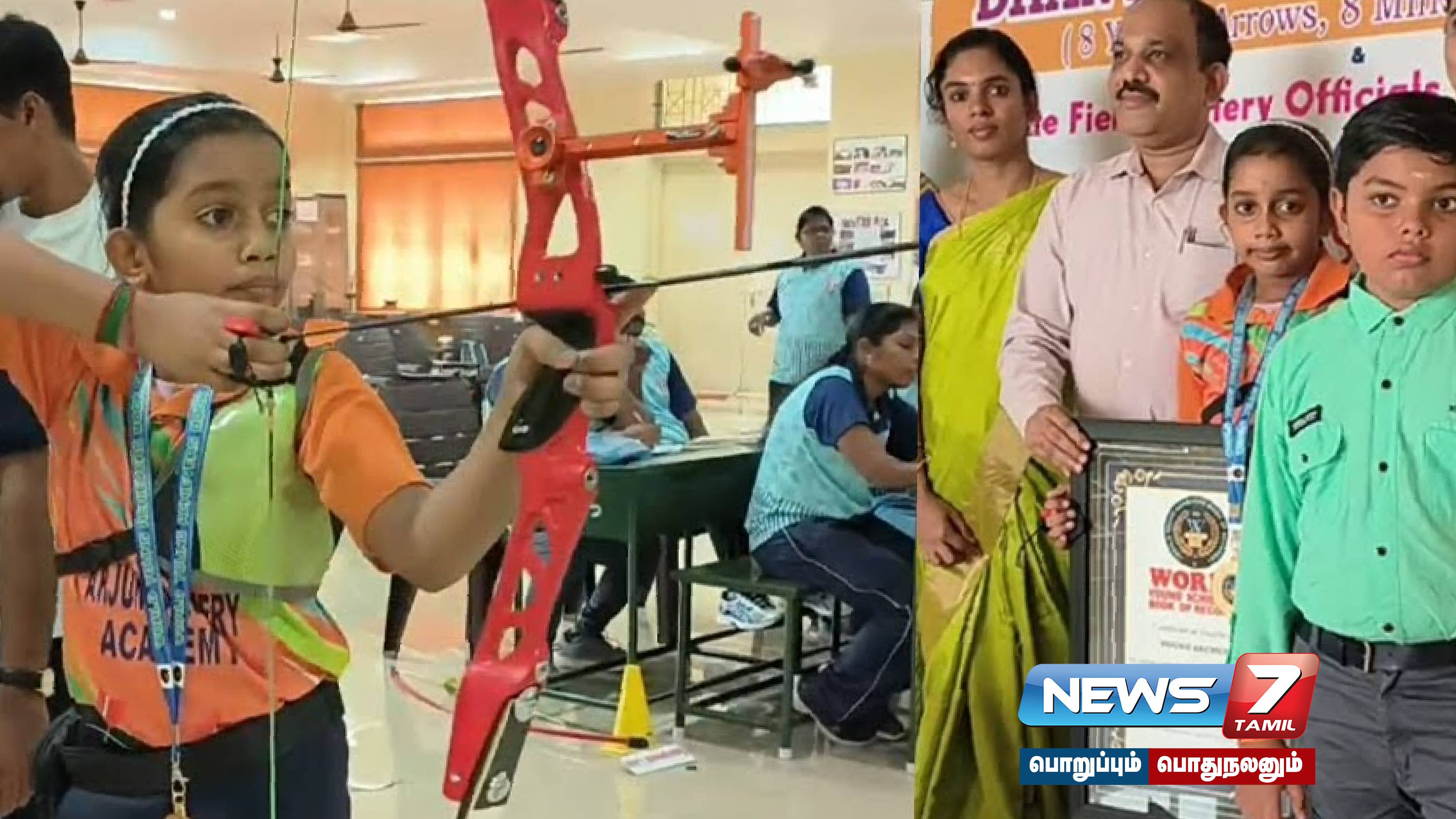 தமிழ்நாடு உடற்கல்வியியல் மற்றும் விளையாட்டு பல்கலைக்கழகம் வளாகத்தில் நடைபெற்ற அம்பு எய்தல் போட்டியில் 8 வயது சிறுமி 8 நிமிடத்தில் 80 அம்புகளை எய்து புதிய உலக சாதனை படைத்துள்ளாா்.
