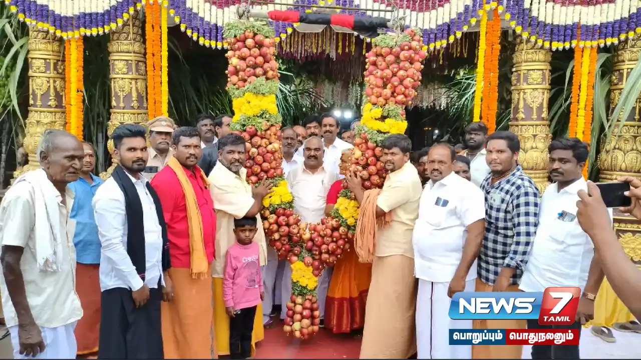செஞ்சியில் சக்தி பூஜையில் கலந்து கொண்ட அமைச்சர் மஸ்தானுக்கு கிரேன் உதவியுடன் 1 டன் ஆப்பிள் மாலை அணிவிக்கப்பட்டது.