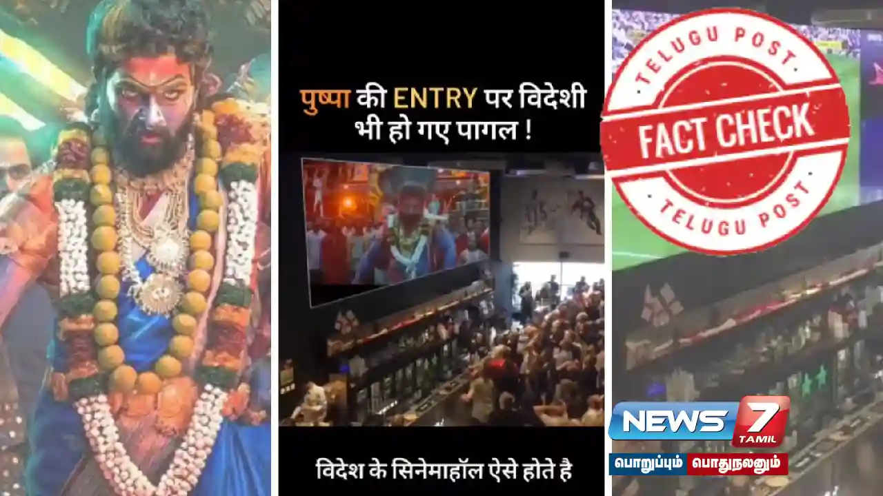 புஷ்பா 2 திரைப்படத்தின் காட்சியை திரையில் கண்ட வெளிநாட்டு ரசிகர்கள் உற்சாகமாக ஆரவாரத்தில் ஈடுபட்டதாக கூறி சமூக வலைதளங்களில் வீடியோ ஒன்று வைரலானது. இதனை ஆய்வு செய்ததில் கால்பந்து போட்டியை திரையில் காண கூடியிருந்த கூட்டத்தினர் ஆரவாரம் செய்யும் வீடியோவில் புஷ்பா 2 திரைப்படத்தின் காட்சிகள் எடிட் செய்யப்பட்டது கண்டறியப்பட்டு சமூக வலைதள பயனர்கள் தவறாக வழிநடத்துகிறது.