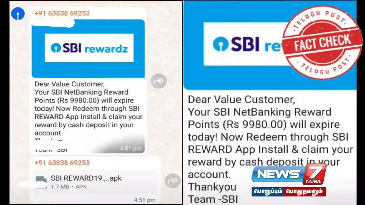 உலகின் பெரும்பாலான நாடுகள் சைபர் கிரைம் குற்றங்களில் சிக்கித் தவிக்கின்றன. சைபர் கிரைம் என்பது ஒரு நபரின் தனிப்பட்ட தகவல்களைத் திருடுவது, வங்கிக் கணக்கை ஊடுருவி பணம் பறிப்பது, கடவுச்சொல், பாதுகாப்பு மீறல் போன்ற அதிகாரப்பூர்வ தகவல்களைக் கொள்ளையடிப்பது போன்ற சட்டவிரோத செயல்களை உள்ளடக்கியது. இந்த இணைய மோசடிக்கு தினமும் யாராவது ஒருவர் பலியாகின்றனர். சமீபத்தில் ஸ்டேட் பேங்க் ஆஃப் இந்தியா தொடர்பான செய்தி ஒன்று சமூக வலைதளமான வாட்ஸ்அப்பில் வைரலாகி வருகிறது. நீங்கள் எஸ்பிஐ ரிவார்ட்ஸ் புள்ளிகளை Redeem செய்ய விரும்பினால், உங்களுக்கு அனுப்பப்பட்ட எஸ்பிஐ ரிவார்ட்ஸ் செயலியின் apk கோப்பைப் பதிவிறக்கவும் என பதிவு பகிரப்பட்டது