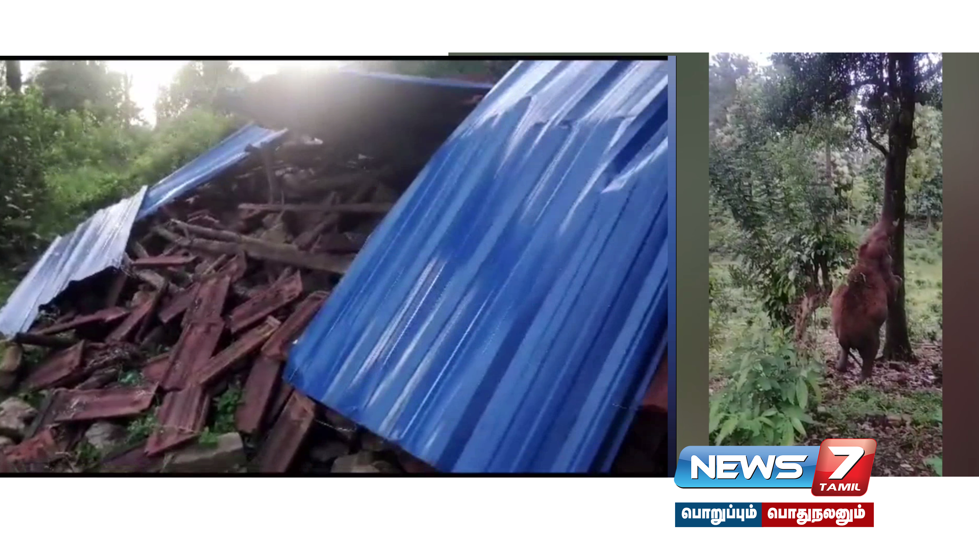 தும்பிக்கைக்கு எட்டவிலை.பசியின் கொடுமையில் விரக்தியின் உச்சத்திற்கு சென்ற காட்டு யானை, சவுந்தரராஜனின் மாட்டுத் தொழுவினை அடித்து நொறுக்கி உள்ளது.
