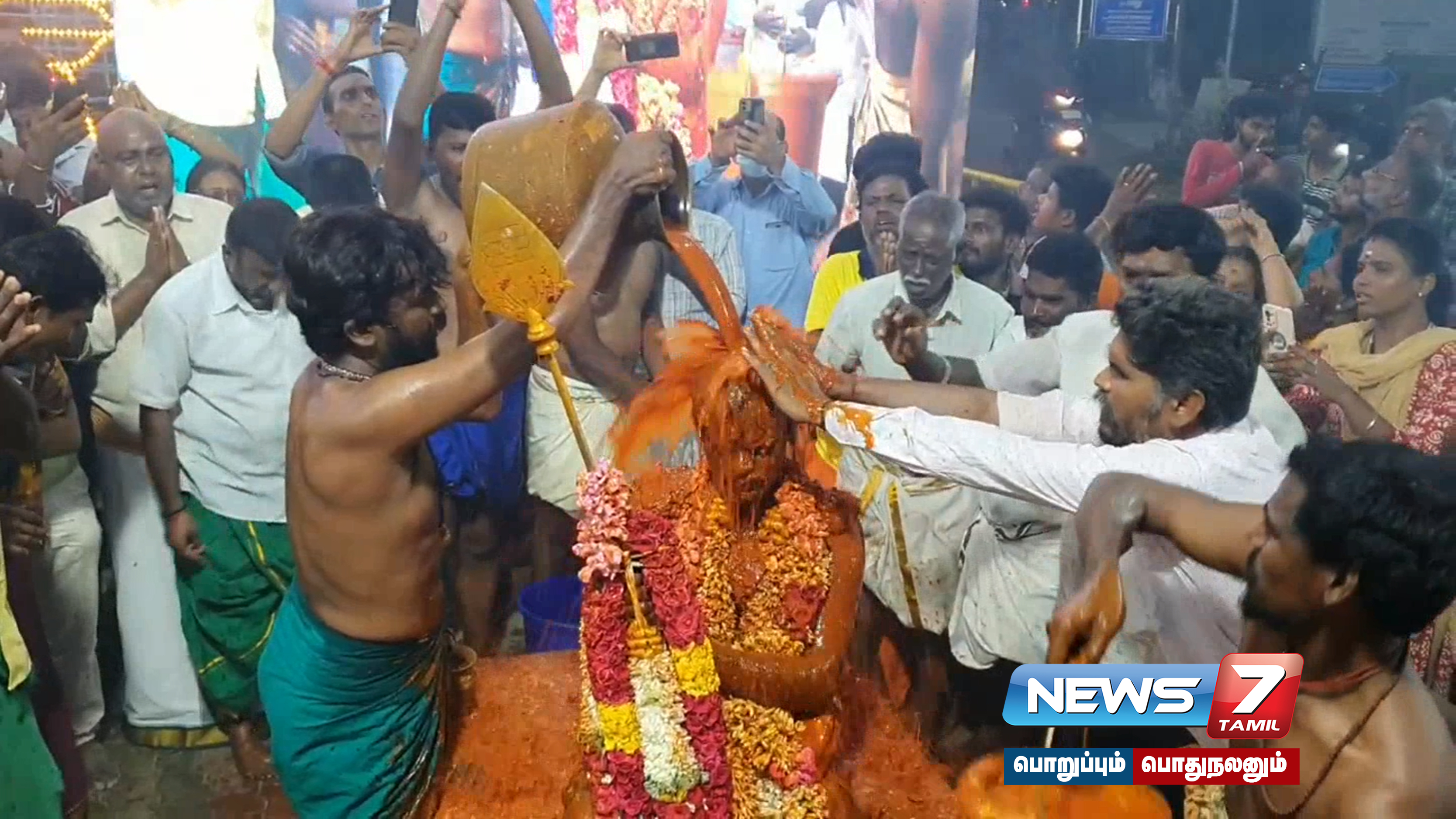 சென்னை அருகே சித்திரை கிருத்திகையை முன்னிட்டு முருகன் கோயிலில் பக்தர் ஒருவருக்கு மிளகாய்ப் பொடி கரைசல் அபிஷேகம் செய்யப்பட்டது.