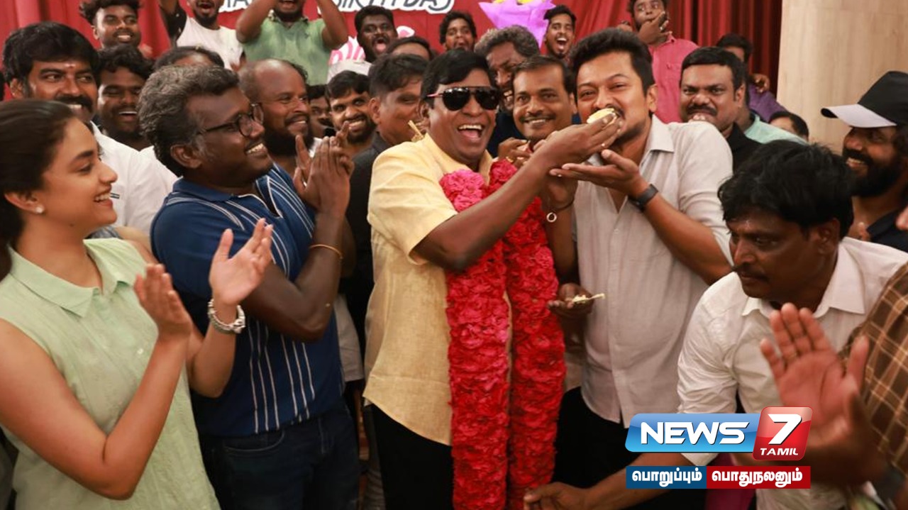 படக்குழுவினருடன் இணைந்து மகிழ்ச்சியுடன் கேக் வெட்டி கொண்டாடினார் நடிகர் வடிவேலு.