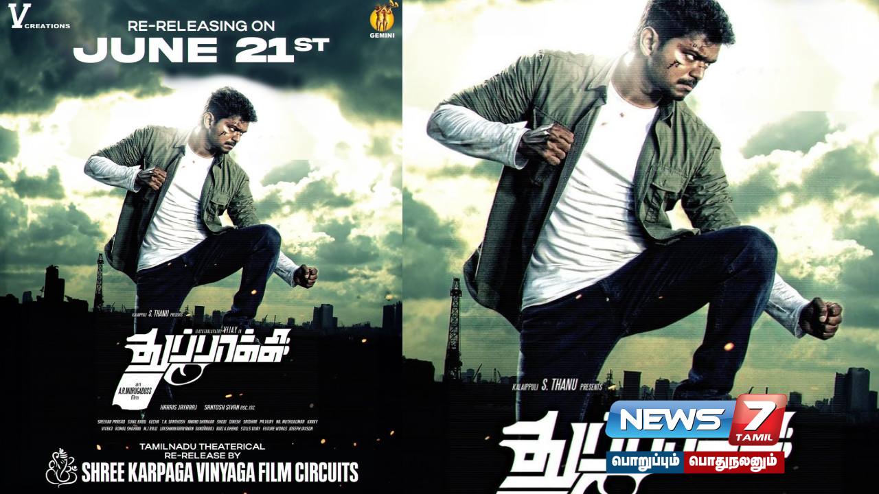 விஜய் நடிப்பில் வெளியாகி வெற்றிபெற்ற ‘துப்பாக்கி‘ படம் ஜூன் 21ம் தேதி ரீ-ரிலீஸ் ஆகிறது.