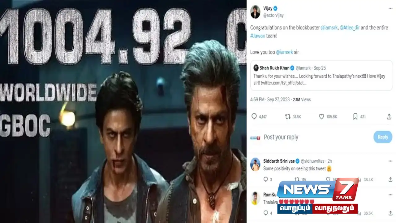 இந்நிலையில், நடிகர் விஜயின் ரசிகர் பக்கத்தில் ஜவான் திரைப்பட வெற்றிக்கு வாழ்த்து தெரிவிக்கப்பட்டது. இதற்கு நன்றி தெரிவித்த ஷாருக்கான், விஜயின் அடுத்த திரைப்படத்திற்காக ஆர்வமுடன் காத்திருப்பதாகவும், I love Vijay sir! என்றும் கூறியிருந்தார்.
