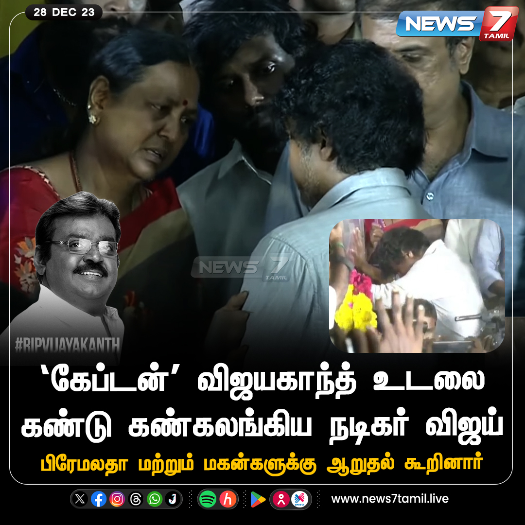 இந்நிலையில், சென்னை கோயம்பேட்டிலுள்ள தேமுதிக அலுவலகத்தில் வைக்கப்பட்டிருந்த விஜயகாந்த் உடலுக்கு அஞ்சலி செலுத்தி, அவரின் குடும்பத்தாருக்கு நடிகர் விஜய் ஆறுதல் கூறினர். விஜயகாந்த் உடல் கண்ணாடிப் பெட்டியில் கிடத்தப்பட்டிருந்ததைக் கண்டு, நடிகர் விஜய் கண் கலங்கியதாக கூறப்படுகிறது. பின்னர் விஜயகாந்த் மகன்களுக்கு ஆறுதல் கூறினார்.