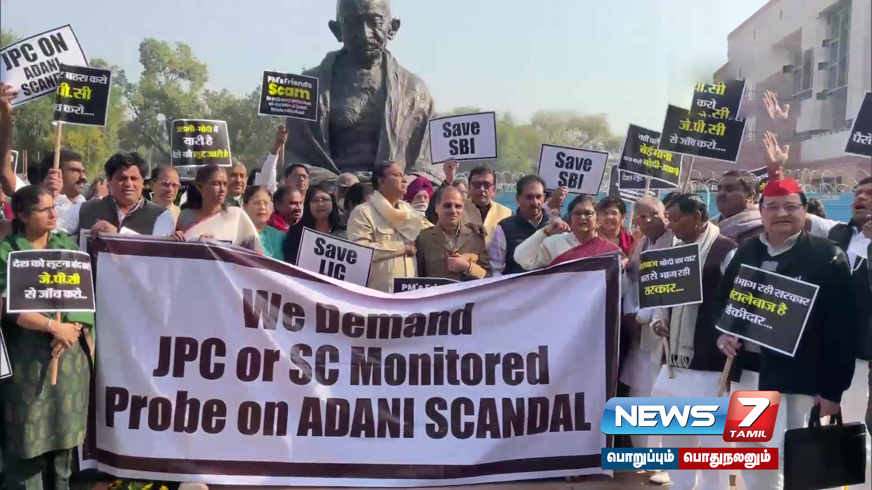 தொடர்ந்து டெல்லி நாடாளுமனற் வளாகத்தில் உள்ள காந்தி சிலை முன்பு, அதானிக் குழும விவகாரத்தில் உச்சநீதிமன்றத்தின் மேற்பார்வையில் விசாரணை நடத்தக் கோரி எதிர்க்கட்சி எம்பிக்கள் போராட்டம் நடத்தினர்.