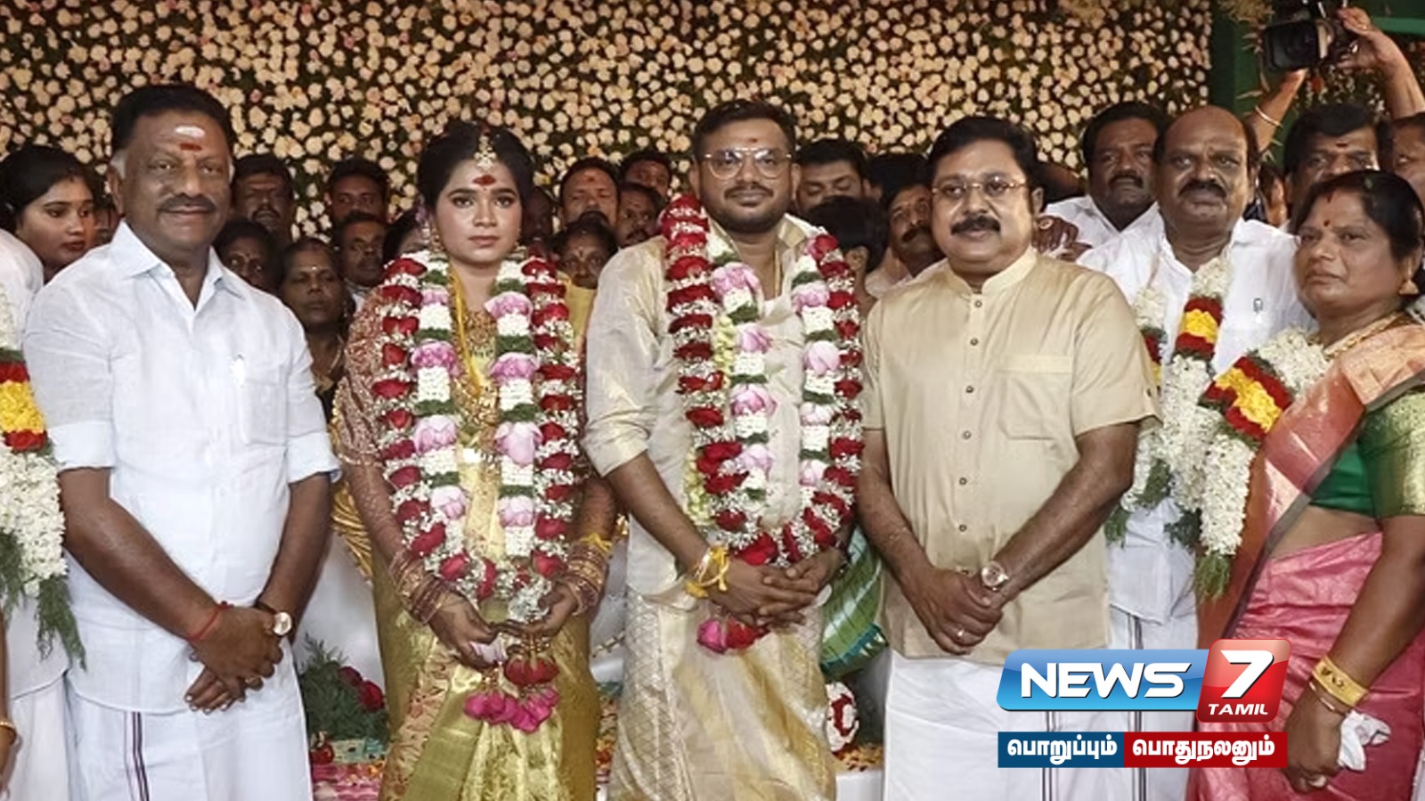 தஞ்சாவூரில் அதிமுக முன்னாள் அமைச்சரும், ஓ பன்னீர்செல்வத்தின் ஆதரவாளருமான வைத்திலிங்கத்தின் இல்லத் திருமண விழா இன்று நடைபெற்றது. இந்த திருமணத்தில் சசிகலா, டி.டி.வி.தினகரன் ஆகியோர் நேரில் வந்து கலந்துகொள்ள வேண்டும் என்று, வைத்திலிங்கம், அவர்கள் இருவரின் வீடுகளுக்கே தேடித் சென்று நேரில் அழைப்பிதல் கொடுத்து, அழைப்பு விடுத்திருந்தார். ஆனால் சில உடல்நலக்குறைவு பிரச்சனைகளால் சசிகலா இந்த திருமண விழாவில் கலந்துகொள்ளாத நிலையில், டிடிவி தினகரன், ஓ.பி.எஸ். ஆகியோர் கலந்துகொண்டனர்.