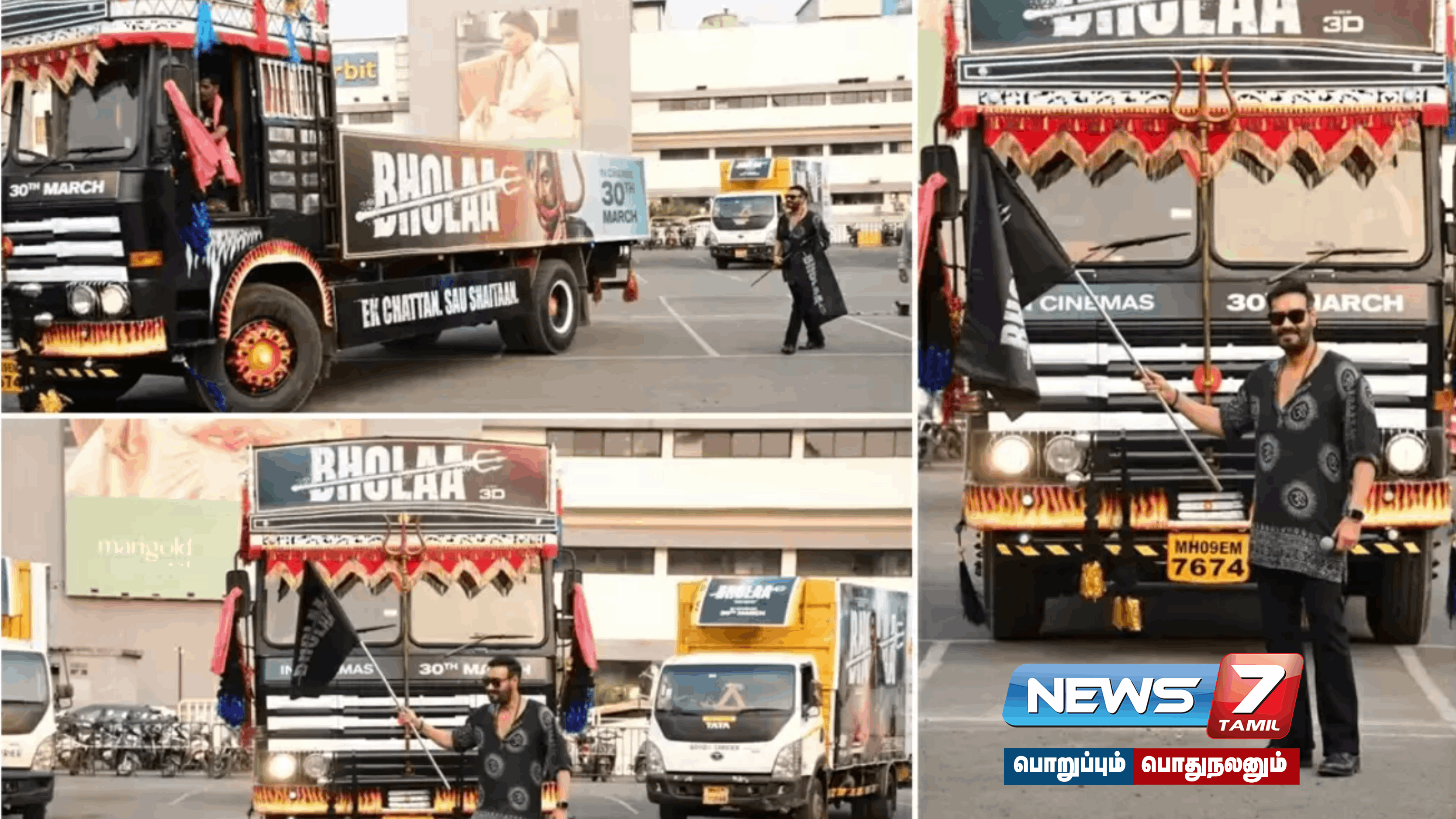 `போலா’ திரைப்படம் வரும் மார்ச் 30ம் தேதி வெளியாக இருக்கிறது. எனவே இந்தப் படத்தின் ப்ரோமோஷன் வேலைகளை படக்குழு தொடங்கியுள்ளது. இந்நிலையில் இந்த படத்தின் போஸ்டர்கள் அமைந்த லாரிகளை நடிகர் அஜய் தேவ்கன் கொடியசைத்து தொடங்கி வைத்தார்.