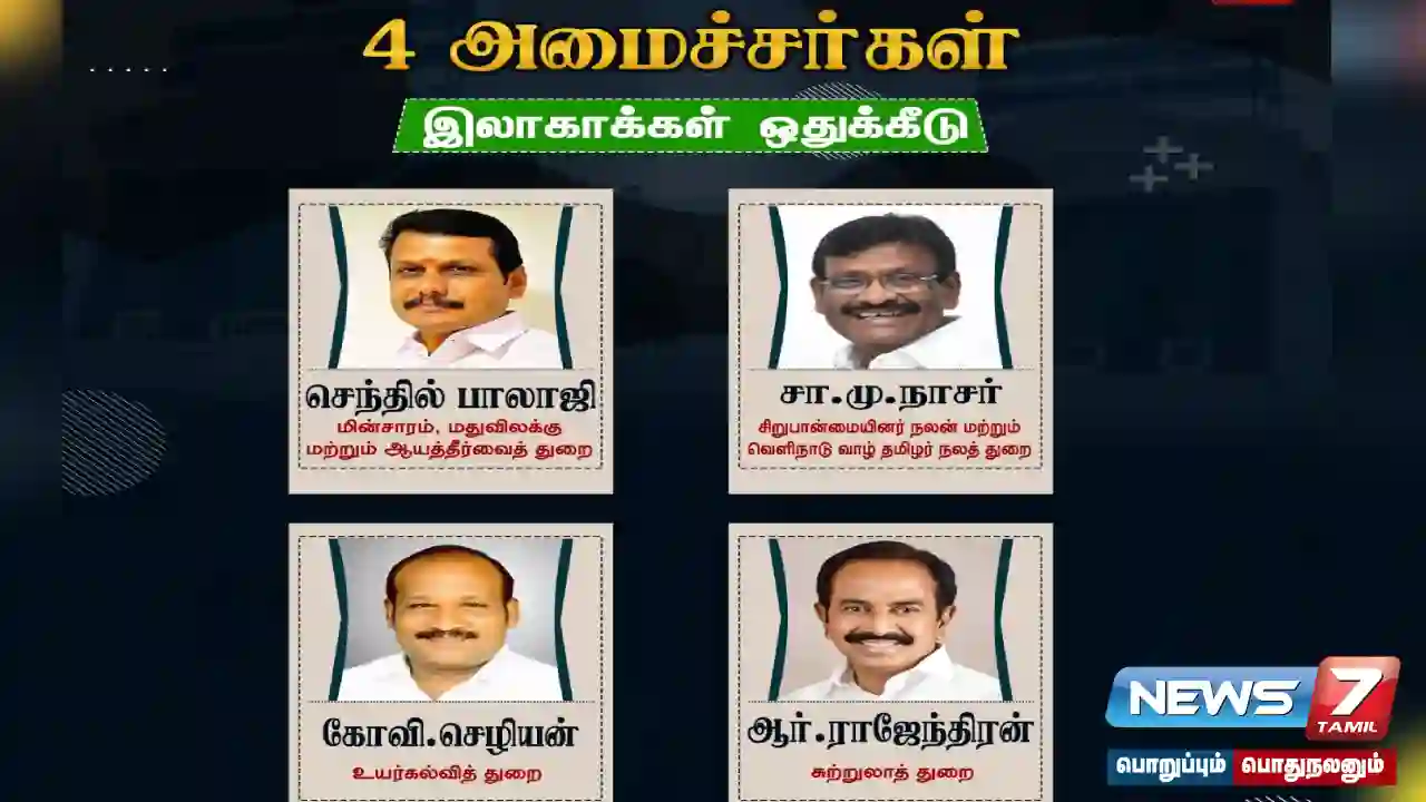 இதனை தொடர்ந்து, சற்று நேரத்திலேயே புதிதாக பதவியேற்ற நான்கு அமைச்சர்களுக்கு இலாகாக்கள் ஒதுக்கி அதிகாரப்பூர்வ அறிவிப்பு வெளியானது. அதன்படி ஆர்.ராஜேந்திரனுக்கு சுற்றுலாத்துறை ஒதுக்கீடு செய்யப்பட்டுள்ளது. செந்தில் பாலாஜி ஏற்கனவே வகித்து வந்த மின்சாரம், மதுவிலக்கு துறை ஒதுக்கீடு செய்யப்பட்டிருப்பதோடு கூடுதலாக ஆயத்தீர்வைத்துறையும் ஒதுக்கீடு செய்யப்பட்டுள்ளது. அடுத்ததாக கோவி செழியனுக்கு உயர்கல்வித்துறையும், சா.மு.நாசருக்கு சிறுபான்மையினர் நலன் மற்றும் வெளிநாடுவாழ் தமிழர் நலத்துறை ஒதுக்கீடு செய்யப்பட்டு அதிகாரப்பூர்வ அறிவிப்பு வெளியாகியுள்ளது.