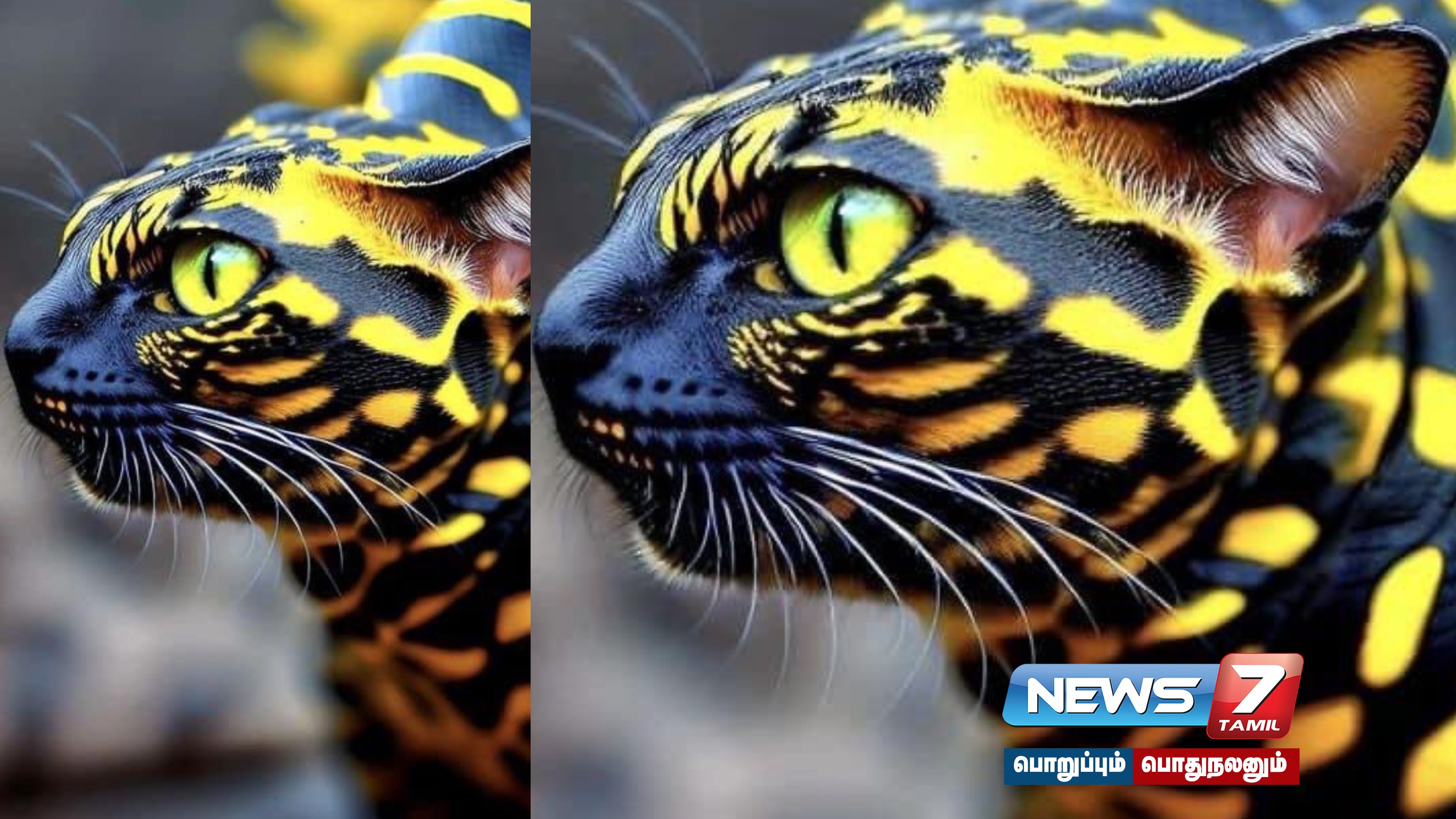 இந்த புகைப்படம் “சர்பென்ஸ் கேடஸ்” என்று கூறப்படுகிறது. இது கருப்பு மற்றும் நியான் மஞ்சள் கோடுகளுடன் கூடிய பூனை. இந்த படம் உண்மையா அல்லது போலியா என பலரும் கேள்வி எழுப்பி வருகின்றனர்.