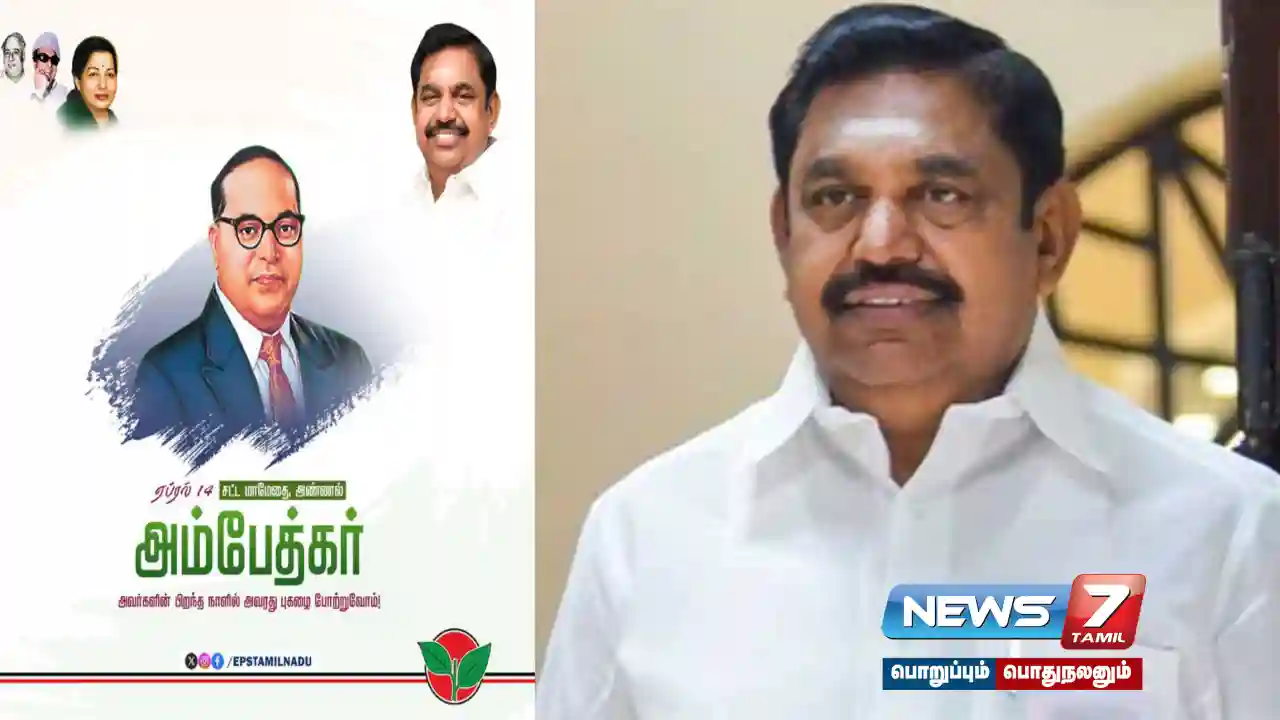 அம்பேத்கரின் 136-வது பிறந்தநாள் தமிழகம் முழுவதும் இன்று கொண்டாடப்பட்டு வருகிறது. இதையொட்டி அதிமுக பொதுச்செயலாளர் எடப்பாடி பழனிசாமி எக்ஸ் தளத்தில் பதிவு ஒன்றை வெளியிட்டுள்ளார். அந்த பதிவில், “சமத்துவம், சமூக நீதி, மானுடப் பற்று ஆகியவற்றின் சின்னமாக விளங்கிய சட்டமேதை, புரட்சியாளர் அண்ணல் அம்பேத்கரின் பிறந்தநாளில் அவர்தம் பெரும் புகழைப் போற்றி வணங்குகிறேன்.