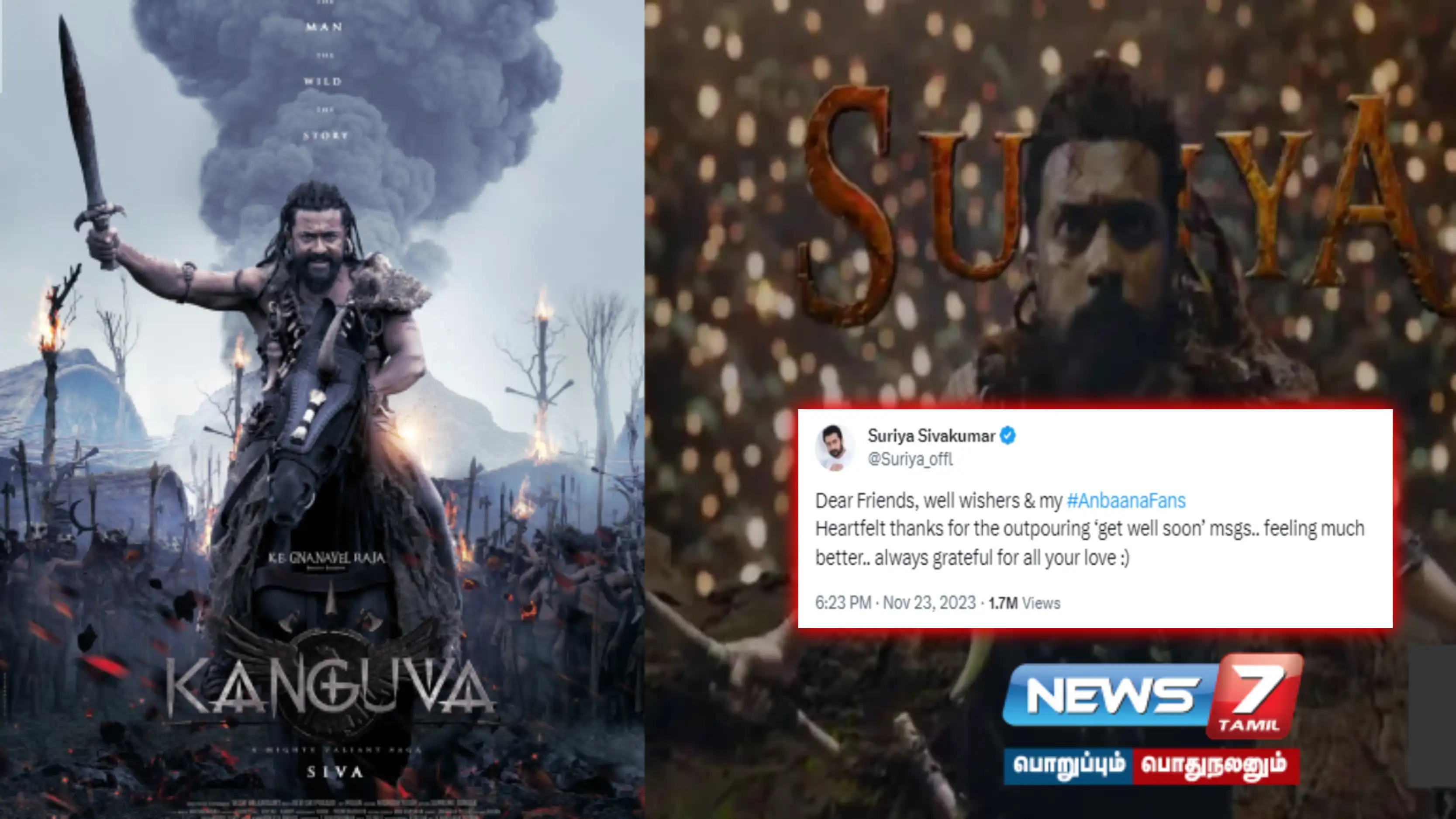 கங்குவா’ படப்பிடிப்பு தளத்தில் நடந்த விபத்தில் நடிகர் சூர்யா நூலிழையில் உயிர் தப்பியதாக வெளியான தகவலையடுத்து, வருத்தங்களை பகிர்ந்துகொண்ட தனது ரசிகர்களுக்கு நன்றி தெரிவித்து பதிவு ஒன்றை நடிகர் சூர்யா வெளியிட்டுள்ளார்.