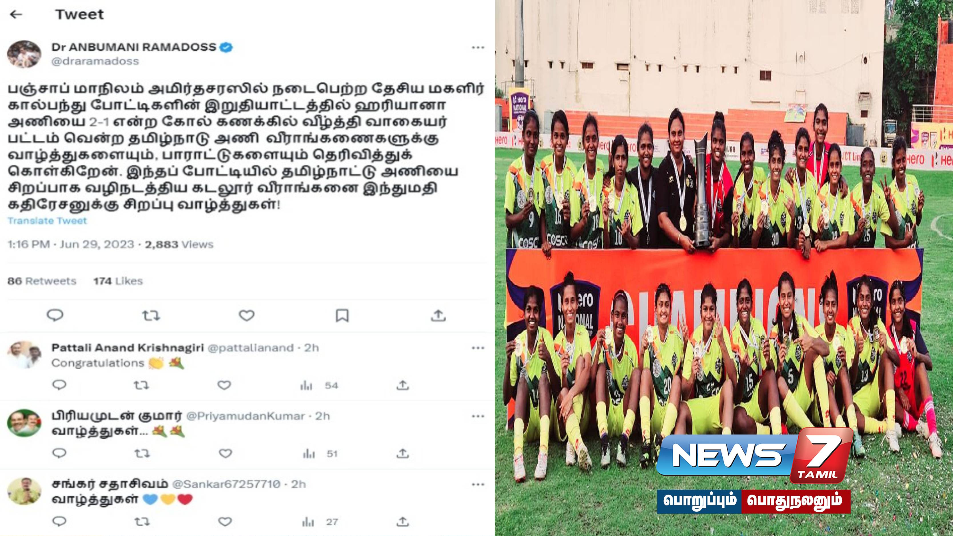 இந்நிலையில், தேசிய சீனியர் மகளிர் கால்பந்து சாம்பியன்ஷிப் பட்டம் வென்ற தமிழ்நாட்டு அணிக்கு, பா.ம.க. தலைவர் அன்புமணி ராமதாஸ் வாழ்த்து தெரிவித்துள்ளார்.