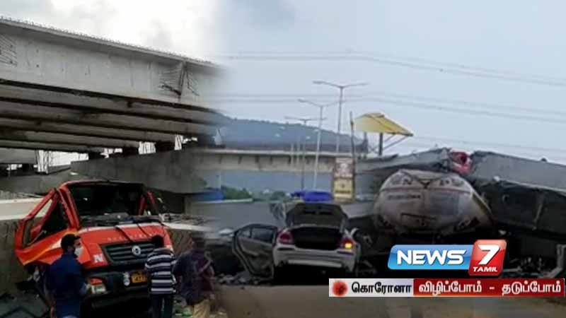 ஆந்திர மாநிலம் விசாகப்பட்டினம் மாவட்டத்திலுள்ள அனகாபள்ளியில்மேம்பாலம் கட்டும் பணி நடைபெற்று வருகிறது. நேற்று மாலை திடீரென தூண்கள் இடிந்து விழுந்ததால் கட்டுமானத்தில் உள்ள மேம்பாலம் சரிந்து சாலையில் சென்று கொண்டிருந்த வாகனங்கள் மீது விழுந்தது இதில் இரண்டு கார்கள், லாரி அப்பளமாக நொறுங்கியது.