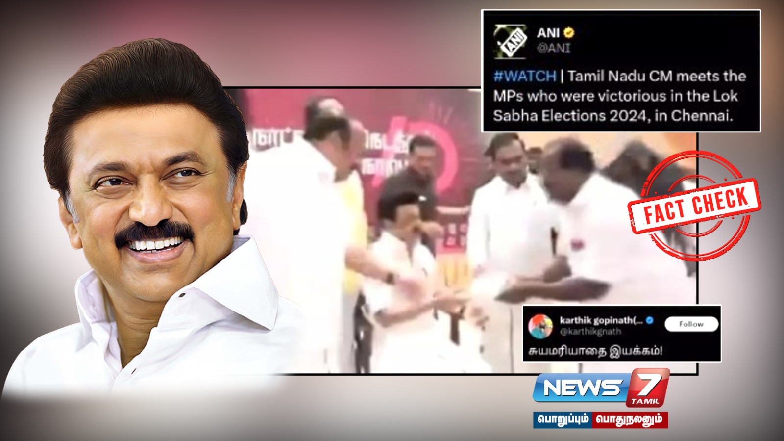 தேர்தலில் வெற்றி பெற்ற எம்பிக்களை முதல்வர் மு.க.ஸ்டாலின் அமர்ந்து கொண்டு வாழ்த்தியதாக ANI தவறாக செய்தி வெளியிட்டது அம்பலமாகியுள்ளது.