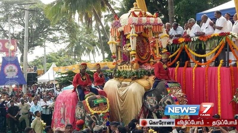 அதன்படி, மாண்டியா மாவட்டம் ஸ்ரீரங்கப்பட்டணா தாலுகாவில் உள்ள சாமுண்டீஸ்வரி அம்மன் கோயிலில் தசரா விழாவுக்கான சாமி ஊர்வலம் நடைபெற்றது. அம்மனை தங்க அம்பாரியில் வைத்து யானை சுமந்துசென்ற போது விழாவில் பட்டாசுகள் வெடிக்கப் பட்டன. தொடர்ச்சியாக பட்டாசுகள் வெடித்ததால் யானை மிரண்டது.